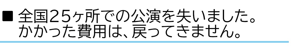 私達劇団は、各地での公演や主催公演などで得た多少の収益を回転させながら次の公演の準備を行なってきました。しかし今年はその収入が途絶え、更にキャンセルに伴う多額の出費が重なってしまい、創立以来最大の危機的状況を迎えています。