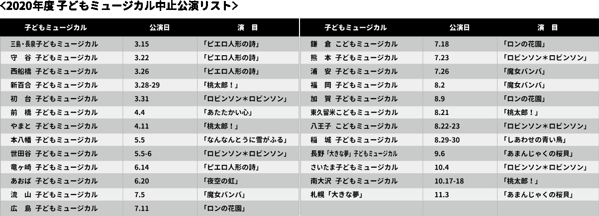 2020年に予定していた子どもミュージカルの公演は、25ヶ所・約60ステージ。劇団スタッフはもとより、子ども達やその家族が、それぞれの地域で約1年前から開催に向けて準備を進めてきました。