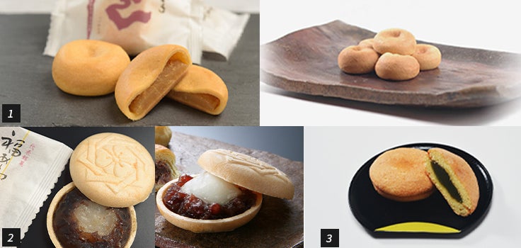茶臼山の月:備前本店付近にある “茶臼山”に昇る月をモチーフに、昔ながらのカステラ生地に抹茶餡を挟んだ、福井堂で最も歴史があり、70年間愛されている和菓子です。