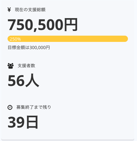 2020/06/12 12:01お世話になっております。本日頂いたご支援にて、目標達成率250%(75万円)になりました。本日までに、ご支援、シェアなどのご協力を頂いた全ての方に心から感謝申し上げます。誠に有難う御座いました!以後、ネクストゴールである100万円達成に向けて、社員一丸となり、変わらぬ努力をして参ります!募集期間が39日御座いますが、今後とも福堂のクラウドファンディングにご注目、ご協力のほど何卒よろしくお願いいたします。今後も、動きがありましたら、投稿させて頂きます! もっと見る