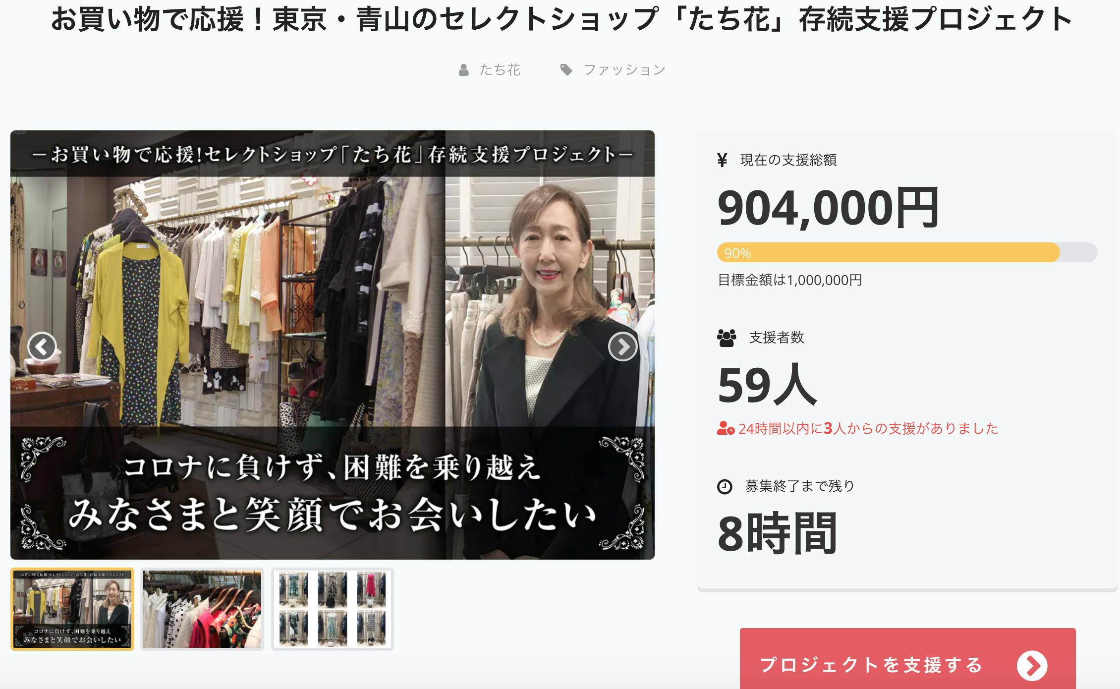 2020/06/19 08:00みなさま、こんにちは。当プロジェクトも残りあと3日となりました。ご支援いただきましたすべての方へ、心よりお礼申し上げます。本当にありがとうございます。プロジェクト終了までお名前がわからないため、すでにお会いしているのにお礼を申し上げていないということもあるかと思いますが、どうかお許しくださいませ。現時点のご報告です。5/18(月)18:00よりスタートしました当プロジェクト、6/18(木)24:00現在、目標金額 ¥1,000,000- に対し、◆支援総額 ¥893,000-◆達成率 89.3%◆支援者数 56人おかげさまで90%近いご支援をいただきました。たち花のお客様、私の友人知人、娘がお世話になっている方々やお友達、そしてお会いしたことのない方々まで、大変多くのみなさまに支えられ、目標金額まであと10%強となりました。本当にありがとうございます。募集終了まで残り『3日』。引き続きのお願いとなり恐縮ではございますが、SNSや口コミでの情報拡散、ご支援のほど、何卒よろしくお願いいたします。自粛が解除されても当面はマスク着用、除菌、消毒…という生活が続きますね。みなさま、どうかお身体ご自愛くださいませ。お店は現在通常営業しております。日増しにお客様がいらしてくださるようになり、少しずつですが活気を取り戻しつつあります。まだまだ前年までには到底及びませんが、みなさまのあたたかいご支援を心の糧に、気を引き締めて頑張ってまいります!青山方面にお越しの際は、ぜひお立ち寄りくださいませ。1時間に1回の換気、アルコールスプレー完備、マスク着用など、コロナ対策を行いながら、みなさまのお越しを心よりお待ちしております。 もっと見る