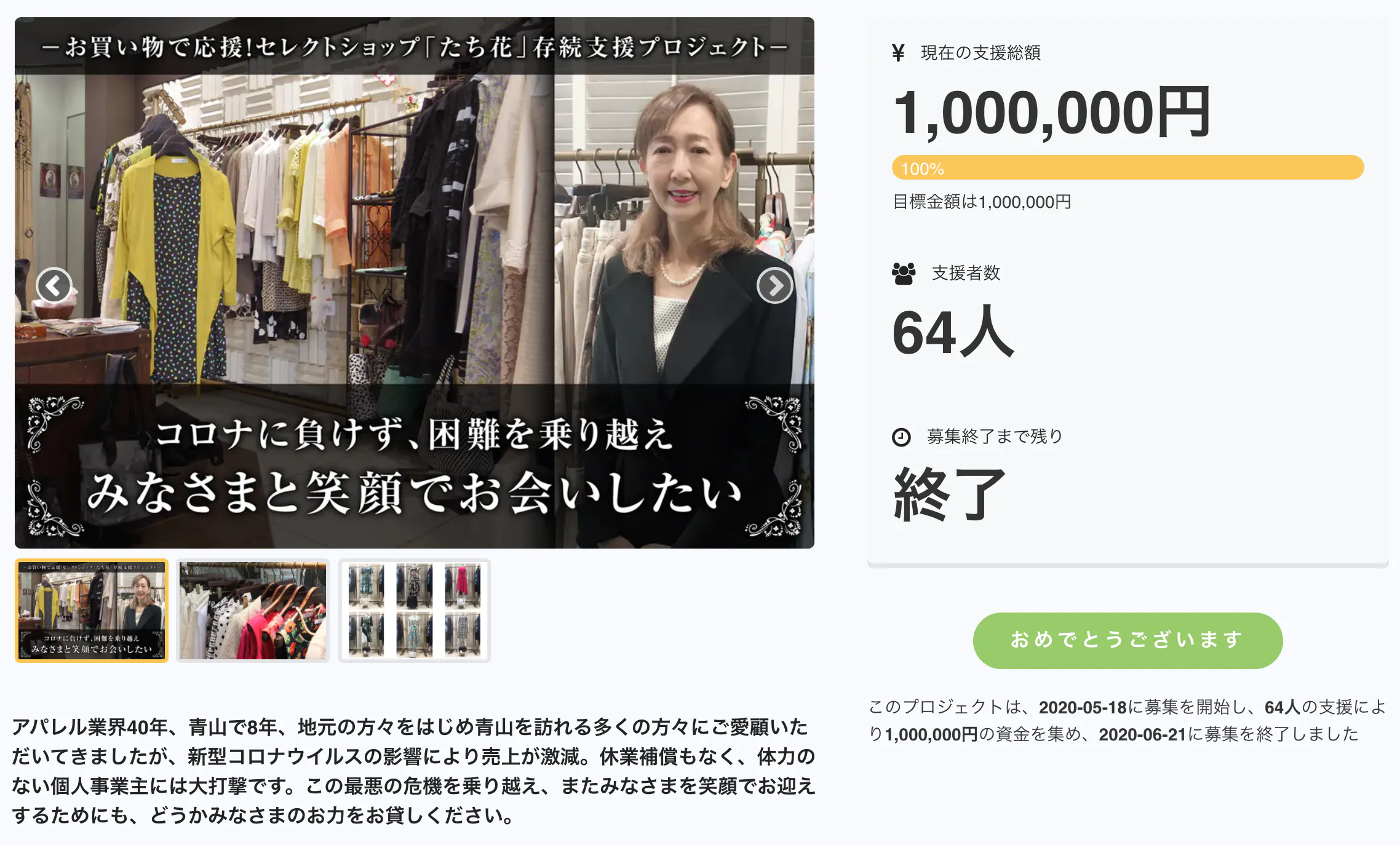 2020/06/25 23:006月21日をもちまして、クラウドファウンディング・プロジェクトが終了しました。 最終的に、 64名の方々から、 合計1,000,000円のご支援をいただきました! (目標金額1,000,000円に対し100%) ご支援いただきましたみなさまへ心より御礼申し上げます。 ▼クラウドファウンディングに初挑戦してみて思ったこと 娘から「ママ、クラウドファンディングやろうよ」と言われたときは、お恥ずかしながら、「クラウドファンディングってなに?」という状態でした。 その後、どういうものか知り、挑戦してみたいという思いが強くなりました。 と同時に、葛藤も生まれました。 ・こんな小さなお店が挑戦しても応援してもらえないのではないか ・今スグお使いいただけないお買い物券をリターンにしていいのだろうか ・プロジェクトを広めるためには自分や娘の友人知人に支援を求める形になってしまうが、そんなことしていいのだろうか など、かなり悩みましたが、 結果として、挑戦してよかった! と心から思っています。 みなさまのご支援・応援が、資金面はもちろんのこと、精神面においても大きな後押しとなったからです。 たくさんの方々からのあたたかい応援により、ふさぎこみそうになるときも元気をいただきました。そして、みなさまの応援や期待に応えたいという思いが日増しに強くなり、厳しい状況のなかでも踏ん張っていこうという原動力となりました。 たち花のお客様、私の友人知人、娘がお世話になっている方々やお友達、そしてお会いしたことのない方々まで、 大変多くのみなさまに支えられ、励まされ、感謝の思いでいっぱいになった1ヶ月間でした。 本当にありがとうございました。 ▼リターンの発送につきまして お買い物券・永久割引パスを本日発送いたしました。6月29日(月)よりご利用いただけますので、ぜひお店に遊びにいらしてください。▼さいごに プロジェクト期間中、SNSでシェアしていただいたり、あたたかい応援メッセージをいただいたりと、さまざまな形でご支援いただきました。 なかには、「支援方法がわからないからお金持ってきました!」とわざわざ当店まで足をお運びいただき、支援金をご持参される方もいらっしゃいました。 さまざまな形でご支援をいただいたみなさま、本当にありがとうございました! 緊急事態宣言が解除されてから、徐々にではありますが、街に活気が戻ってきたように感じています。 とはいえ、まだまだ油断はできず、厳しい状況は続きますが、みなさまの応援を糧にこの状況を乗り切っていけるよう頑張ります! 引き続き、あたたかいご支援のほど、何卒よろしくお願い申し上げます。 そして、機会があればぜひ「たち花」へ遊びに来てください(^^) 長文になりましたが、最後までお読みいただきありがとうございました。 みなさまのご健康とご多幸を心よりお祈り申し上げ、御礼のご挨拶とさせていただきます。 ありがとうございました。 たち花 平川由美子 もっと見る