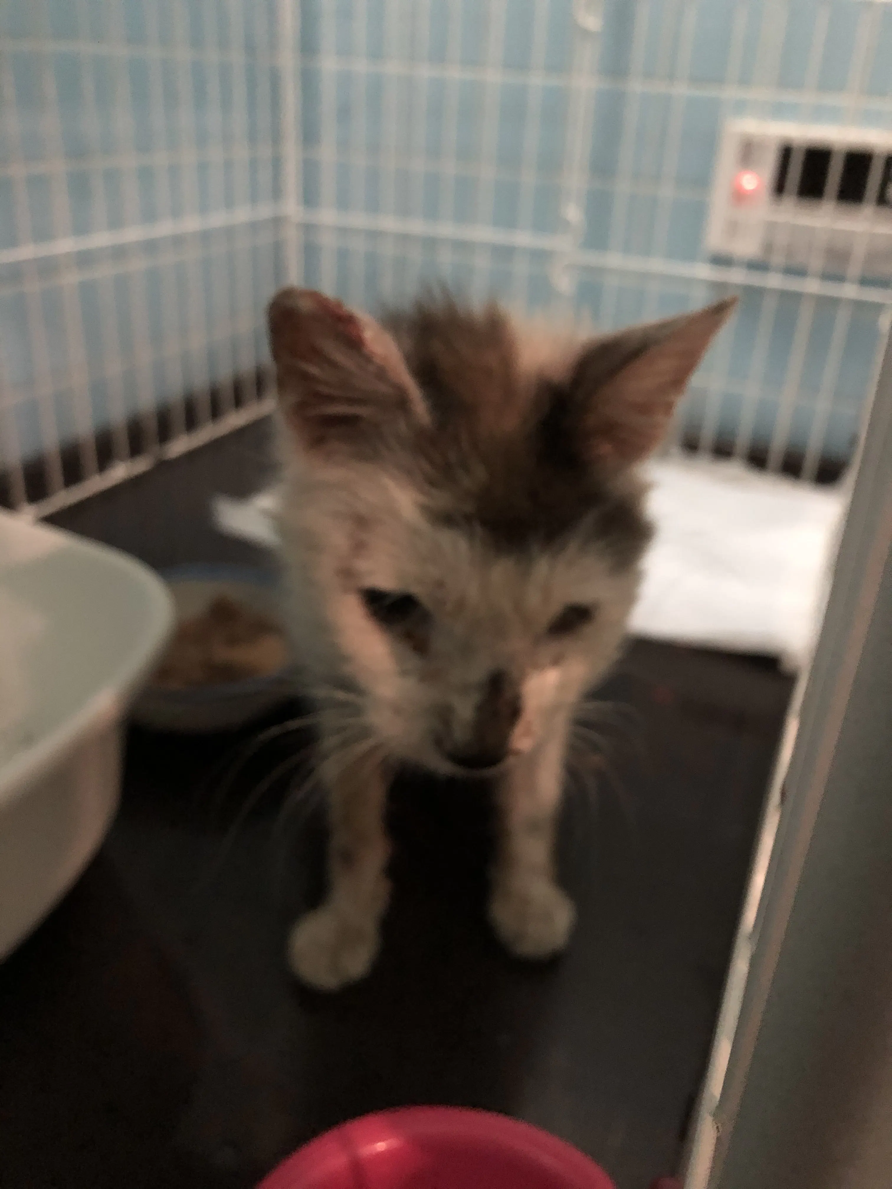 状態は、とても厳しい状態です。真菌、衰弱、体重は成猫ですが1.9キロしかないです。