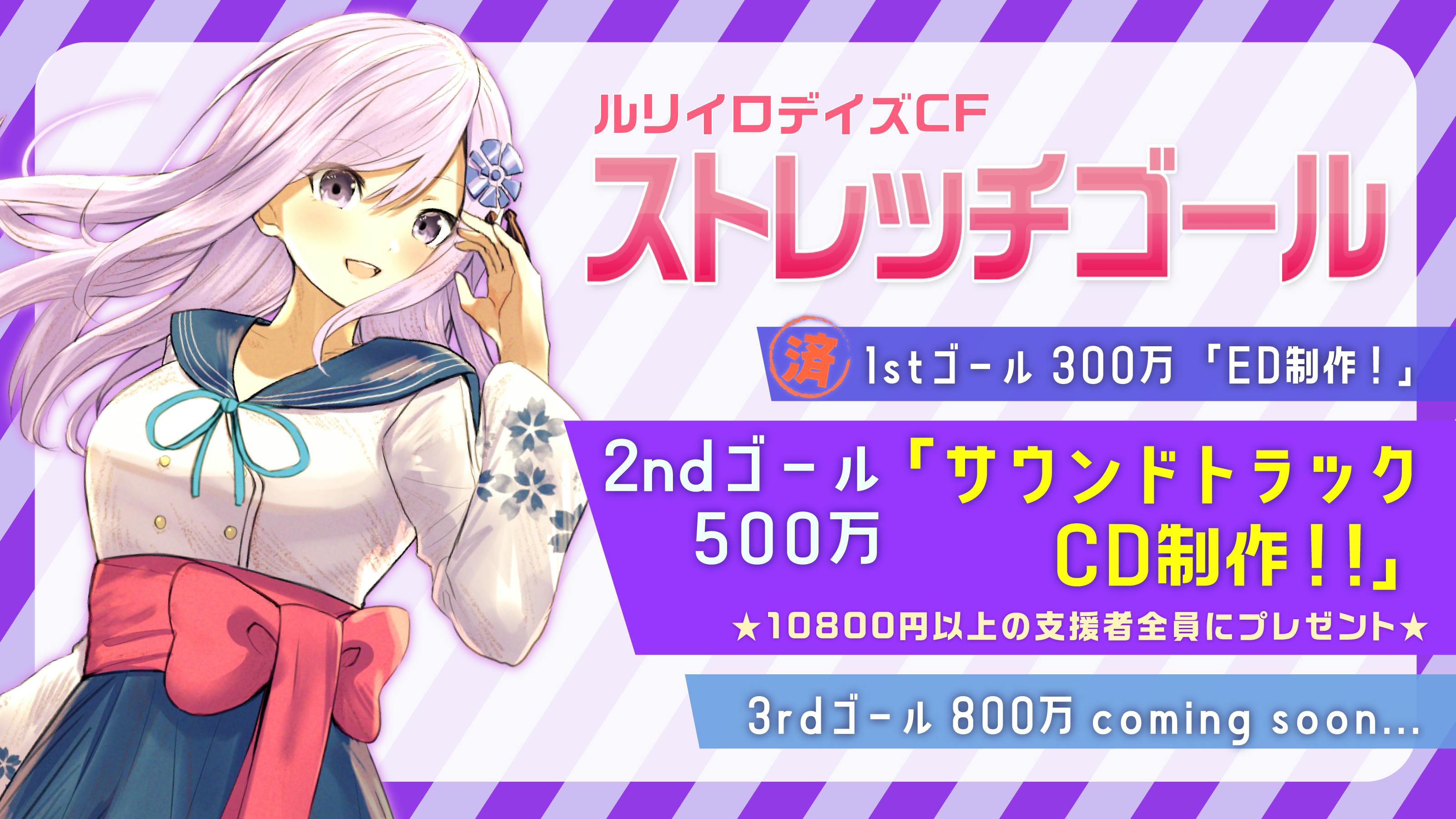 そちらのご支援金額で、「サウンドトラックCD制作」また、「10800円以上の支援者全員にプレゼント」させていただこうと考えております。