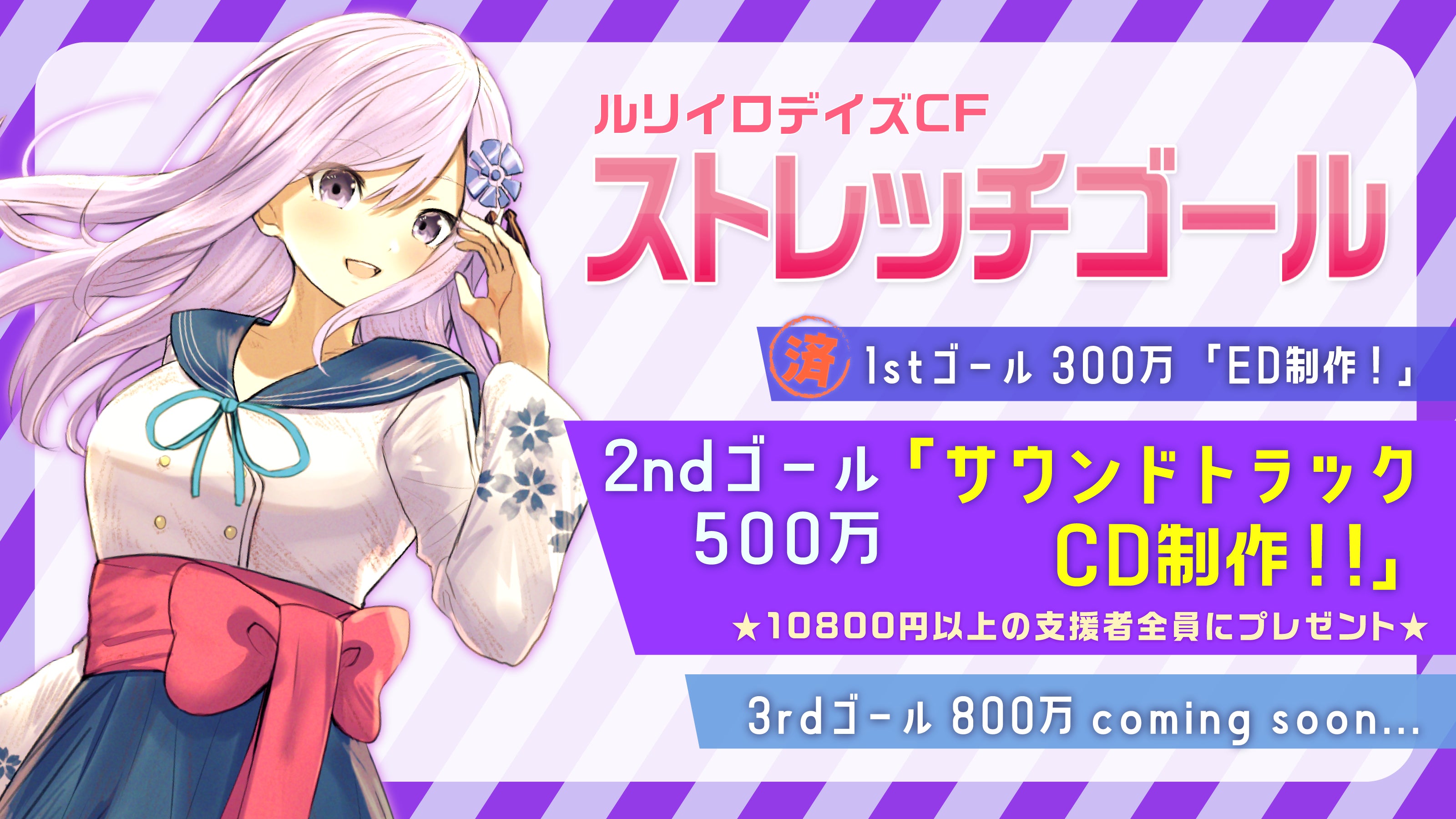 皆様に多大なご支援いただいております「ルリイロデイズ」ですが、この度新たな高みを目指すと共に【500万円】のストレッチゴールを設定させていただき、そちらのご支援金額で、「サウンドトラックCD制作」また、「10800円以上の支援者全員にプレゼント」させていただこうと考えております。サウンドトラックの詳細内容に関しましては、またお伝えをさせていただければと思いますので、お披露目までお待ちください。VNovel運営 taxi