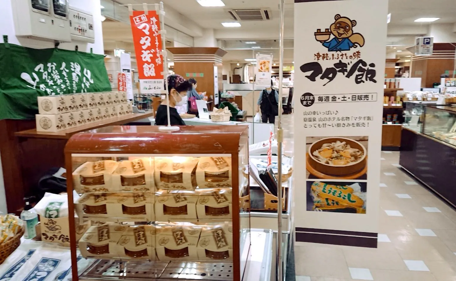 土手町は東京で言うところの銀座。その一等地に百貨店を構える中三様の地下食品売り場が最近リニューアルされ、弘前エール飯の弁当売り場を作ってくださいました。弊社では6月末までの毎週末金土日、「マタギ飯弁当」を販売させていただいております。
