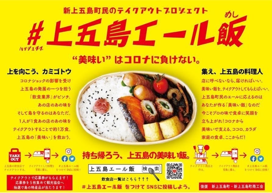 町民有志が立ち上がり飲食事業者の支援をしています。「上五島エール飯」と銘打ち SNS、ホームページ、フライヤー作成による情報発信を行い飲食店が行うテイクアウト事業の利用を島民に促してきました。