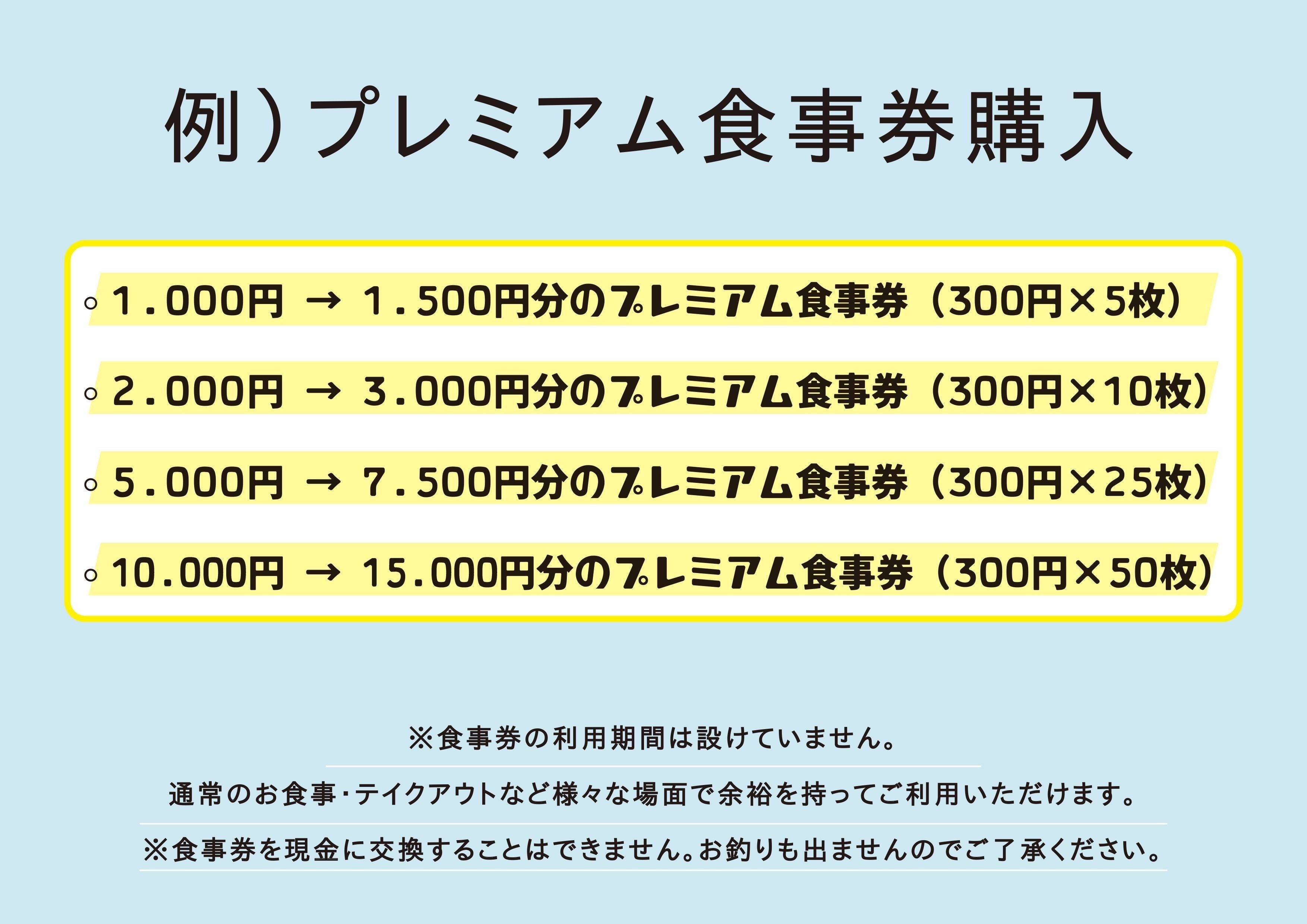 1.000円ごとに、500円分お得な「プレミアム食事券」(1.000円単位で購入可能)を島内の飲食店を利用されるお客様を対象に販売し、継続的な飲食店利用促進を目指します。