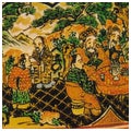 飯田屋:赤で綿密に人物などを描き、まわりを小紋で埋め尽くし、金彩を加えた赤絵細密画である。