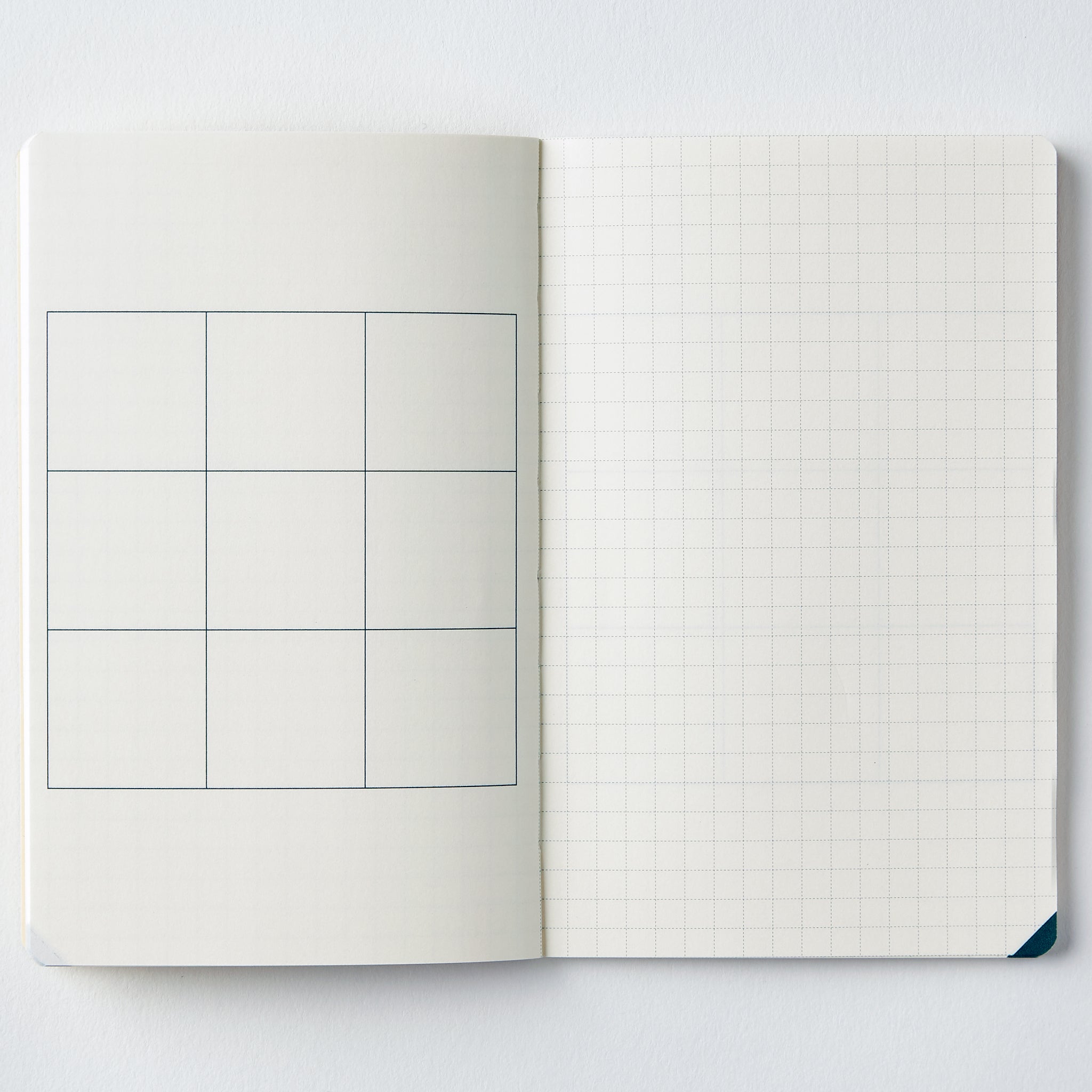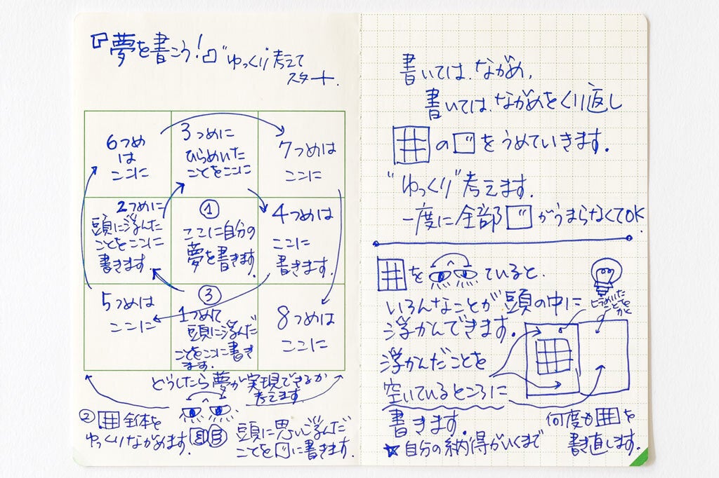 M9notesの見開き(左ページ3×3の9マスのマンダラ・右ページは5mm方眼)