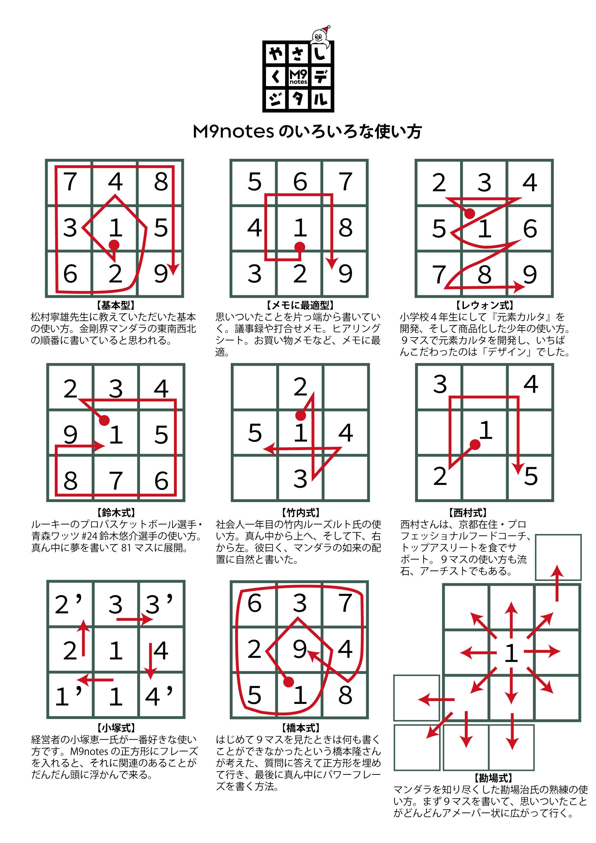 M9notesの書き方は自由です。自由というと、なかなか書きにくいとうこともあります。だから、YouTubeライブやホームページで、M9notesの使い方の身近な事例を紹介しています。他人のを見て、真似してはじめてもOKです。M9notesには9つの正方形があるだけです。罫線以外に余計なモノはありません。M9notesの使い方をYouTubeライブを使ってオンラインをはじめました。今、50回を超えました。私たちのところに身近な事例、いろいろな使い方が集まりはじめました。右脳をインスパイアする方法は、10人いれば10通りあるのだな〜と思いました。【基本型】松村寧雄先生に教えていただいた基本の使い方。金剛界マンダラの東南西北の順番に書いていると思われる。【メモに最適型】思いついたことを片っ端から書いていく。議事録や打合せメモ。ヒアリングシート。お買い物メモなど、メモに最適。【鈴木式】ルーキーのプロバスケットボール選手・青森ワッツ#24鈴木悠介選手の使い方。真ん中に夢を書いて81マスに展開。【レウォン式】小学校4年生にして『元素カルタ』を開発、そして商品化した少年の使い方。9マスで元素カルタを開発し、いちばんこだわったのは「デザイン」でした。【竹内式】社会人一年目の竹内ルーズルト氏の使い方。真ん中から上へ、そして下、右から左。彼曰く、マンダラの如来の配置されているマスに自然と書いたそうです。【西村式】西村さんは、京都在住・プロフェッショナルフードコーチ、トップアスリートを食でサポート。9マスの使い方も流石、アーチストでもある。【小塚式】経営者の小塚恵一氏が一番好きな使い方です。M9notesの正方形にフレーズを入れると、それに関連のあることがだんだん頭に浮かんで来ます。【橋本式】はじめて9マスを見たときは何も書くことができなかったという橋本隆さんが考えた、質問に答えて正方形を埋めて行き、最後に真ん中にパワーフレーズを書く方法。【勘場式】おそらく私の知る中で9マスを使う最年長・勘場治氏の熟練の使い方。まず9マスを書いて、思いついたことがどんどんアメーバー状に広がって行く。【YouTubeオンライン】https://www.youtube.com/m9notes【公式ホームページ】https://www.m9notes.jp/部活生、右脳をインスパイアして今の自分を知ろう!