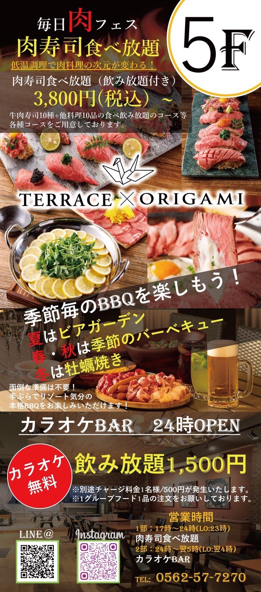 2020年の4月に『テラス/オリガミ(肉寿司・BBQ)』OPEN。