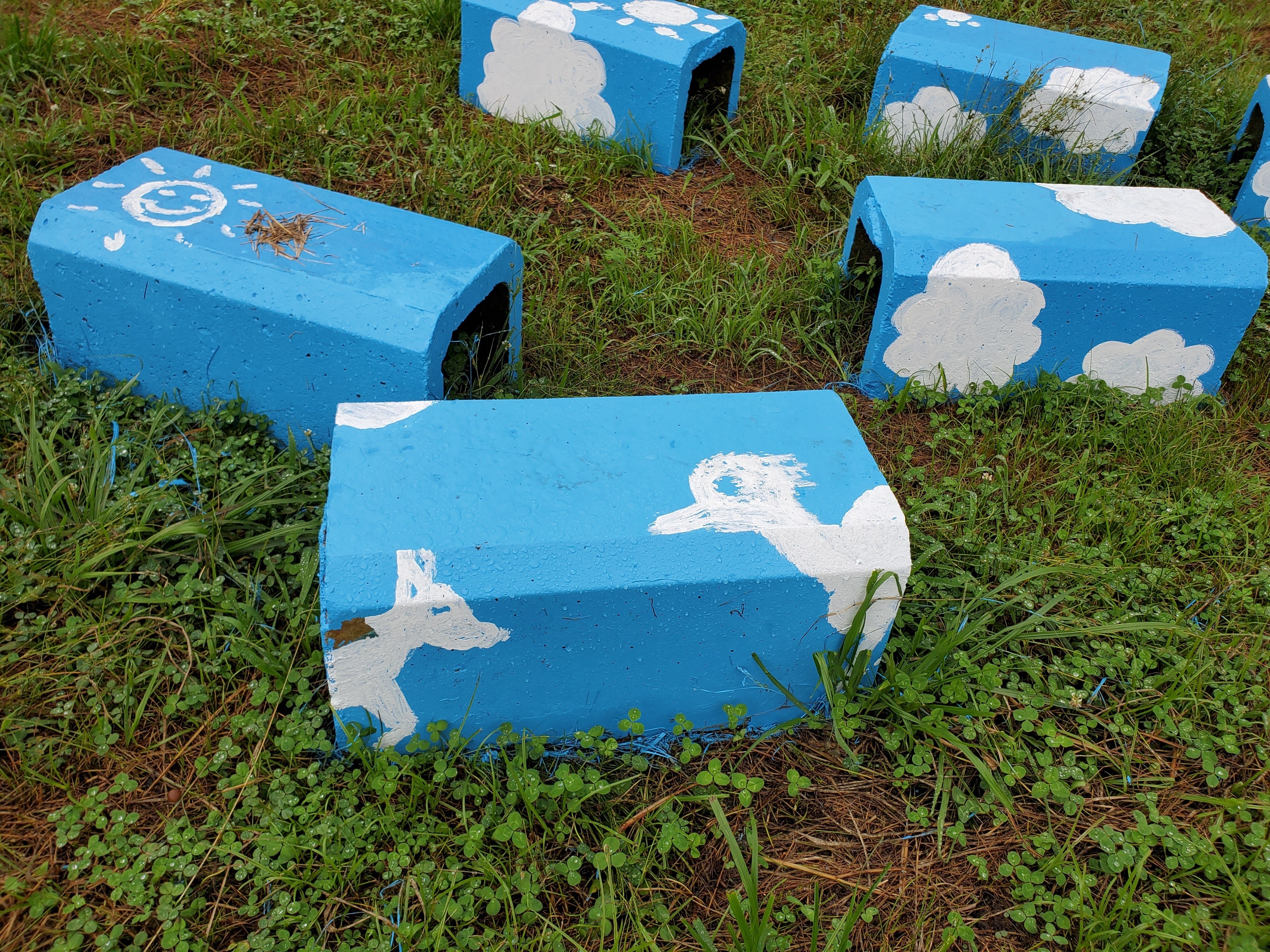 前回の活動報告でダチョウのサマンサやポニーたちを是非お近くで見てくださいとお伝えしていましたので、先日腰をかけてご覧頂けるようにブロックに空の絵をペイントしました。