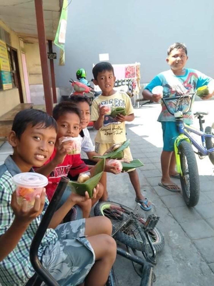2020/08/09 17:52こんにちは、くみです。皆さんにご支援いただいたプロジェクト無事に3週目に突入しました。先週と同様、月曜から金曜の平日ナシジンゴ100食フルーツポンチ100食バリ菓子100個今週も無事に届ける事が出来ました。そして先週末、主人の実家クタから車で4時間のバリ島西部ヌガラへバリ人皆んな大好きバビグリン(豚の丸焼き)100食、支援物資100世帯分を届けに行ってきました。支援物資の内容はインドネシア人の生活に欠かせない米、卵、油、砂糖、インスタント麺です。米、卵、砂糖はヌガラ産です。普段はクタやジンバラン、ヌサドゥアなど都会のホテルに出稼ぎ出てる人が多いヌガラの人たちですが、職を失い、田舎に帰って家畜や農業をしてる人が多いようでした。早くコロナが終息し、元の生活に戻ってホテルでの仕事がしたいと皆んな言ってました。早く観光客が戻ってくる事を皆んなが心から願っています。3週目にして、ナシジンゴが大きなイカになって返ってきたり、沢山のみかんを頂いたり、物々交換がうまれてきました。皆んな助け合って生活しています。いつもナシジンゴを楽しみに取りに来るおじいちゃん。「Genki?Arigato」と覚えたての日本語で声かけてくれたり。ついでにおじいちゃんのバイクのメンテナンスをしてあげたりする若い子たち。心が暖かくなる事が多かった3週目でした。3週間目が無事に終わり、いよいよ来週は最後の週です。一つ一つ心を込めて作り、皆んなと頑張って元気と笑顔を届けて行けたらと思います。引き続き遠くから応援していただけたら嬉しいです。また明日からたくさんの希望と笑顔に満ちた日が始まりますように。ありがとうございました。 もっと見る2週間目を終えて。