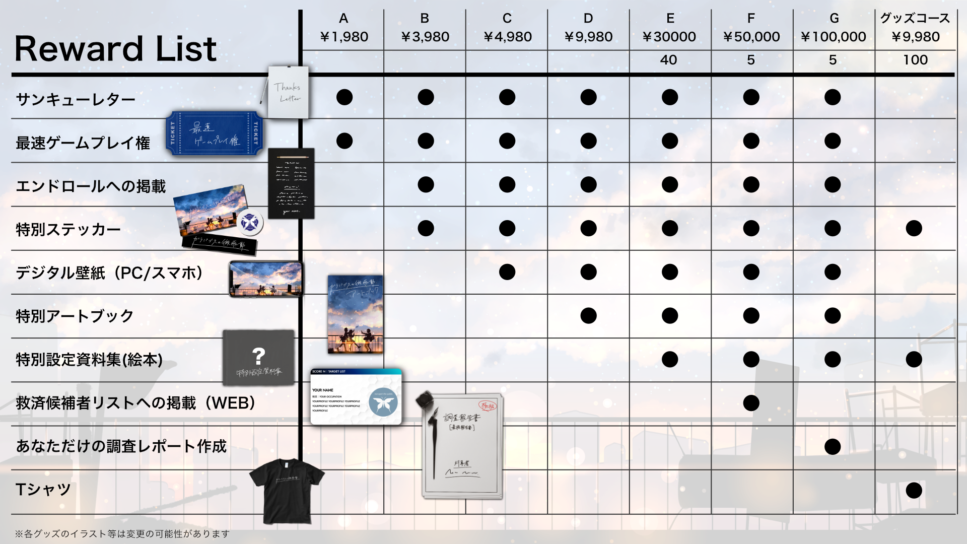 →予定しているリリース日(2020年7月中旬-8月初旬)よりも1週間早く本作品をプレイいただける権利です。支援時にご登録いただいたご住所宛に、少し早めに体験をお届けいたします。