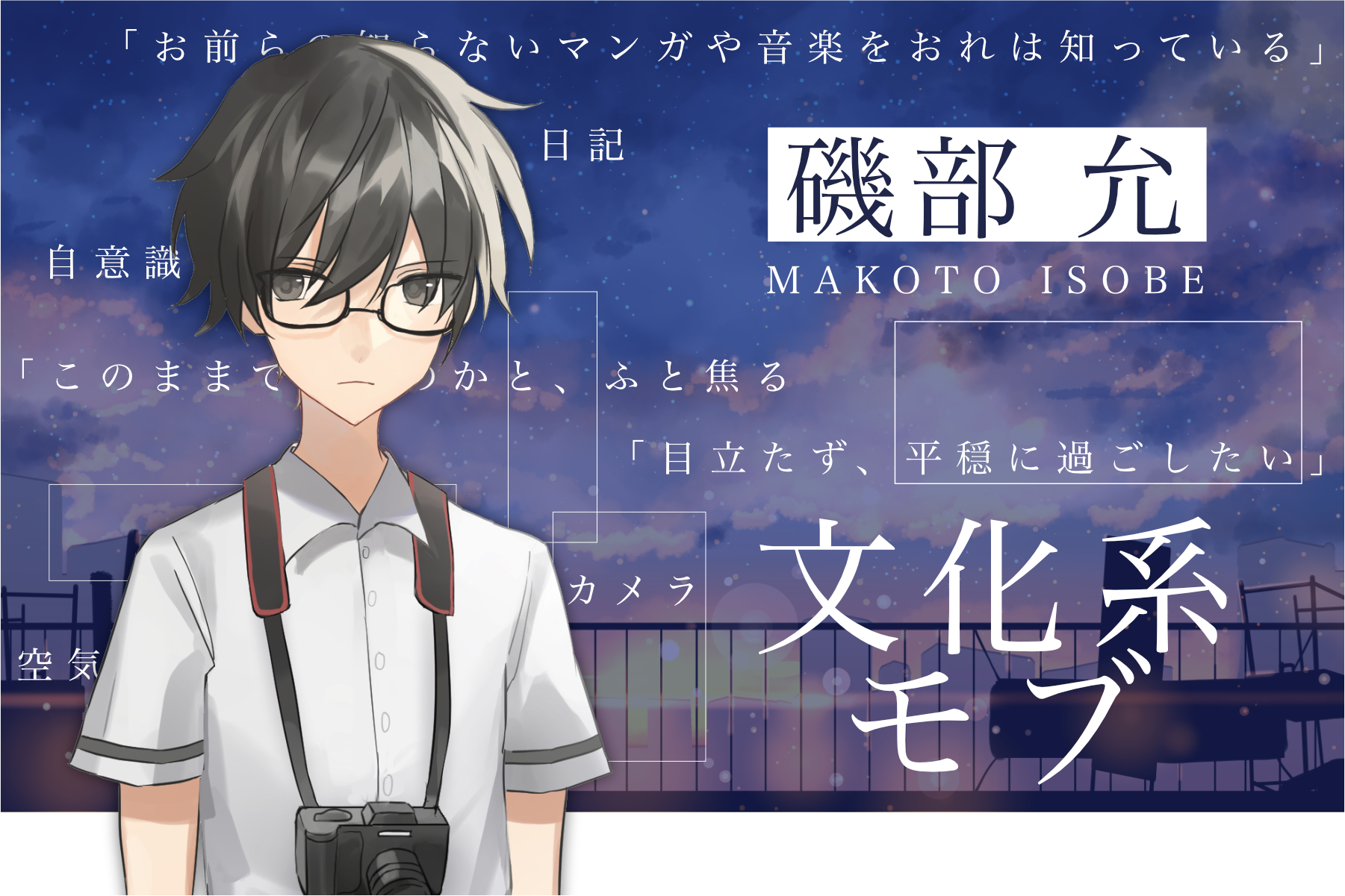 今回、過去編纂対象として選ばれたターゲットの高校時代の姿。カメラを趣味にしており、撮りためた写真はポエミーな文章と共にホムペの日記に掲載している。被写体は、空や建物、人影が主。「まわりが知らないマンガや音楽を知っている自分」に矜恃を抱き、自分を特別な存在だと盲信している。