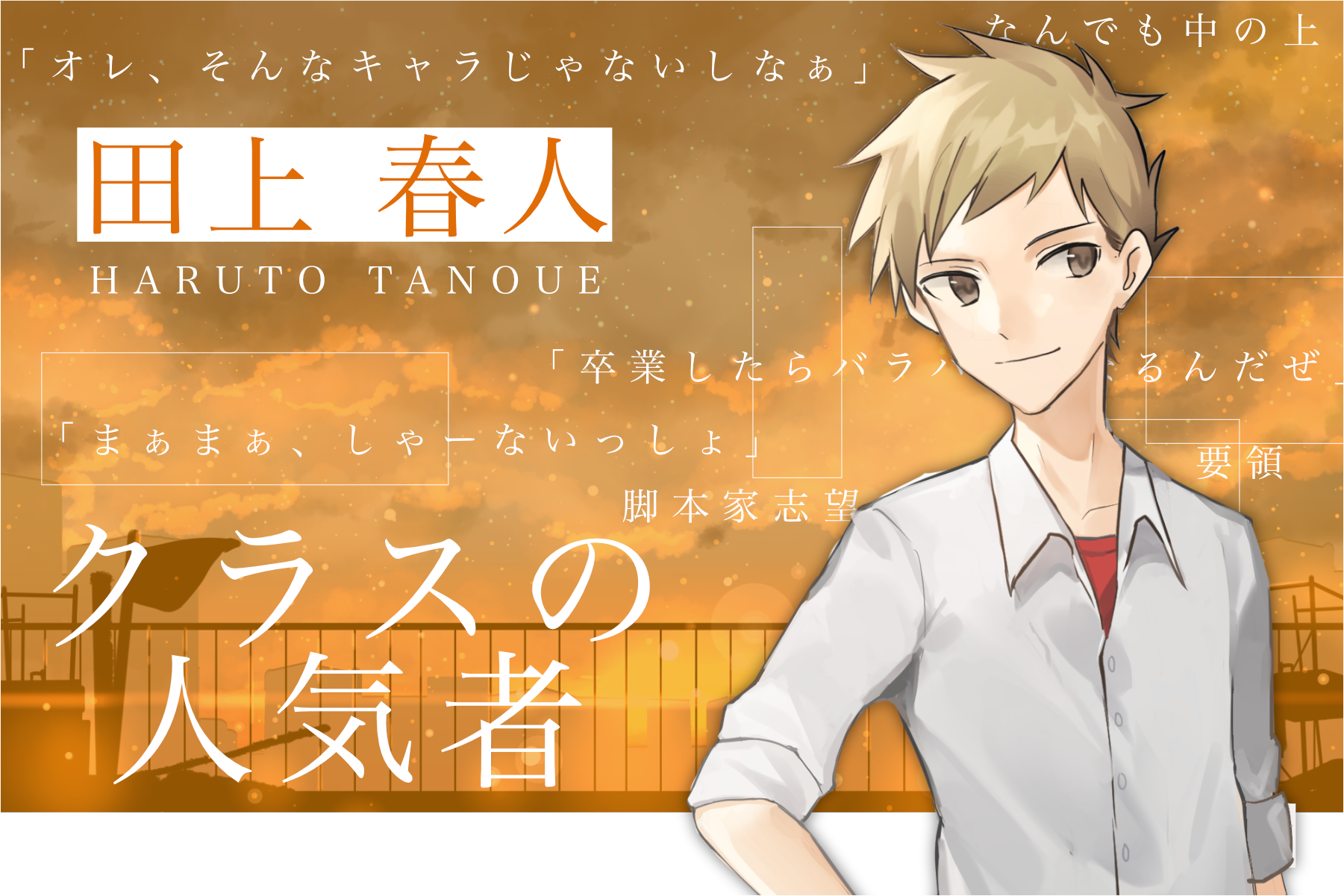 クラス一番の人気者で、とにかく明るく声がでかい。全てのことを卒なくこなせるが突出した特技はない。実は映画の脚本家に憧れておりサブカルにも精通しているが、自分のキャラに合わない夢であるため口外したことはない。磯部とは一度映画の話をしてみたいと様子を伺っている。