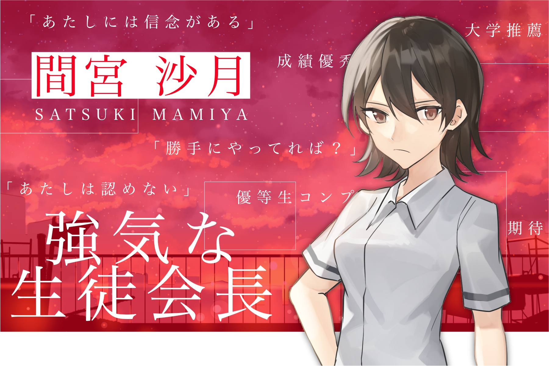 磯部のクラスメイトで強気な生徒会長。人間関係を顧みず正論をぶつけていくため、生徒の一部から恐れられている。官僚になる目標があり、そのためには学歴が必要。豊かではない家庭で育ったため、学費免除の大学推薦を手に入れるべく、生徒会長の座に就いた。教師からの評判は高いが、沙月自身は生徒ファーストではない彼らを嫌悪している。頑固で、自分の非をなかなか認められない。