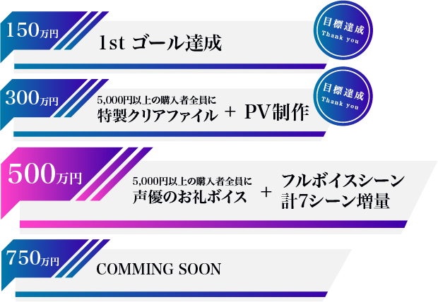 この達成を受け、より一層「ガラパゴスの微振動」の作品クオリティを向上させるため、新たなストレッチゴールを【500万円】に設定させていただきます。ストレッチゴール達成できた場合は、6月末に発表を予定している「声優陣からのお礼ボイス※2」と「フルボイスシーンを計7シーン増量」を実施いたします。※2 お礼ボイスは5000円以上支援いただいた方が対象