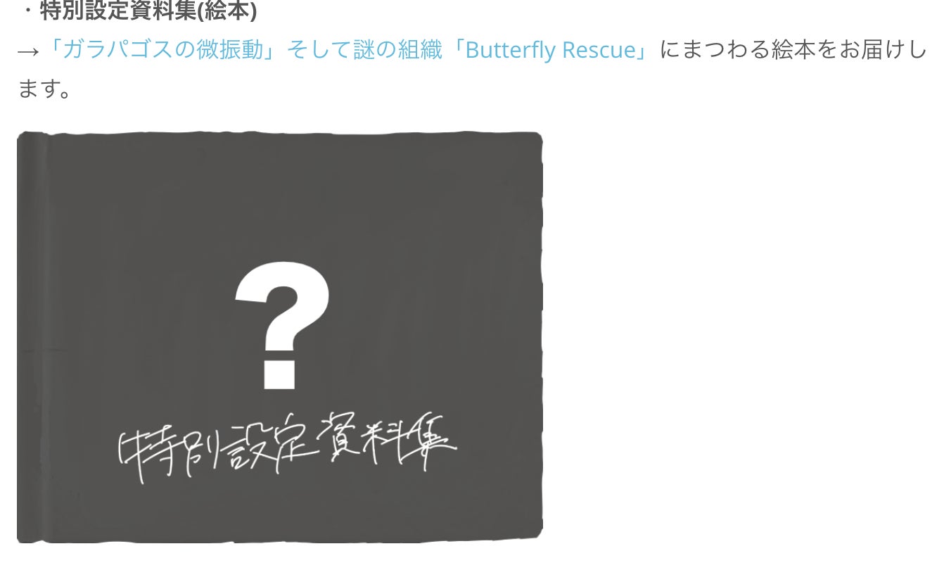 以上がButterfly Rescueからのミッションの顛末でした。そして、クラウドファンディングではなんとその絵本「フラップは無理をしない」だと思われる設定資料集がリワードとして公開されています。ハクビシンを殺した犯人の真相、そして先生とは一体何者なのか。気になる方はぜひご購入ください!