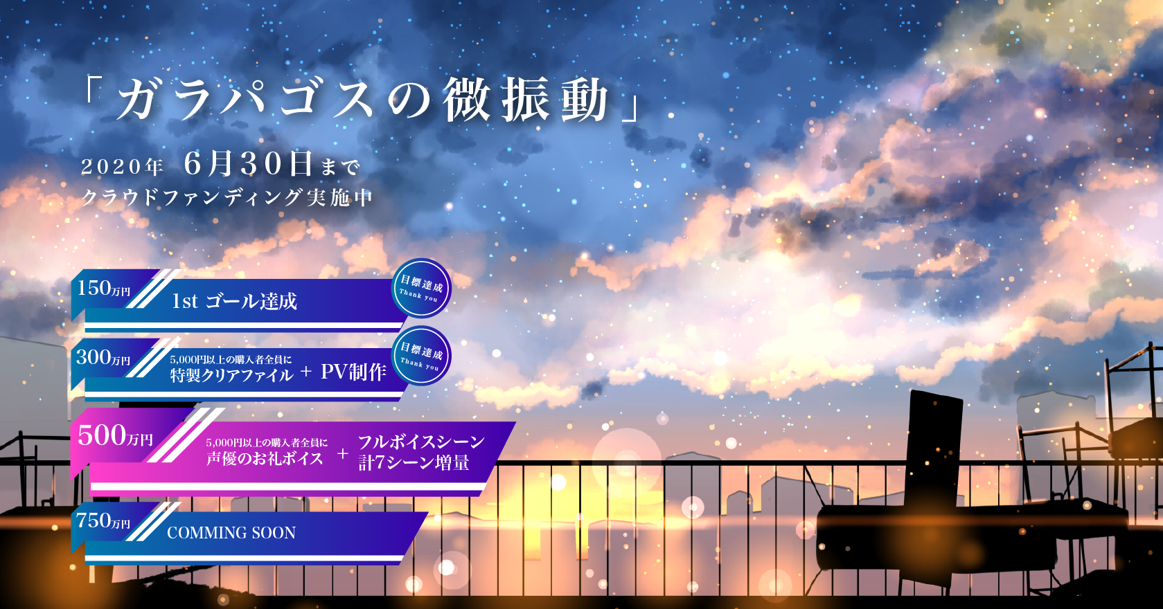 この達成を受け、より一層「ガラパゴスの微振動」の作品クオリティを向上させるため、新たなストレッチゴールを【500万円】に設定させていただきます。ストレッチゴール達成できた場合は、6月末に発表を予定している「声優陣からのお礼ボイス※2」と「フルボイスシーンを計7シーン増量」を実施いたします。※2 お礼ボイスは5000円以上支援いただいた方が対象