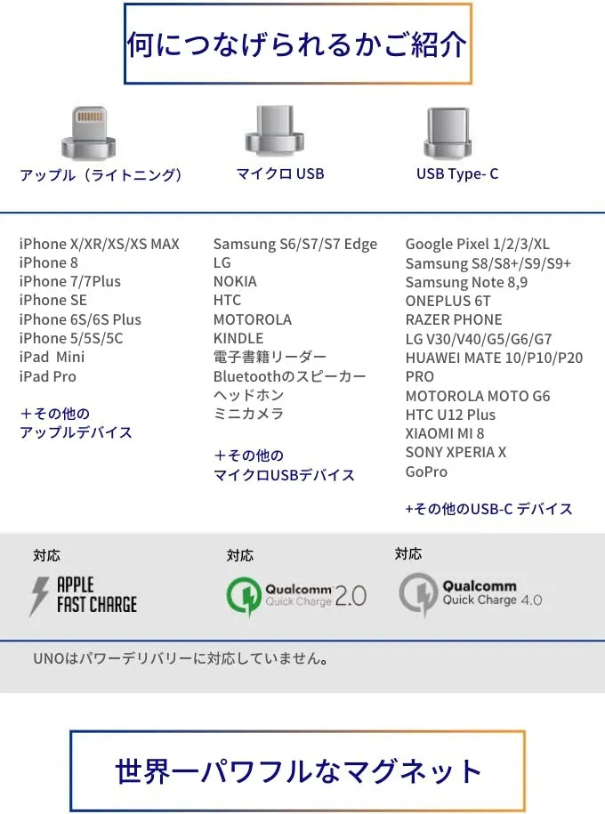 ・UNOのワイヤーは、前のモデルよりも20%太くなって、 QC2.0、QC3.0、QC4.0に対応可能。より充電できるようになりました。