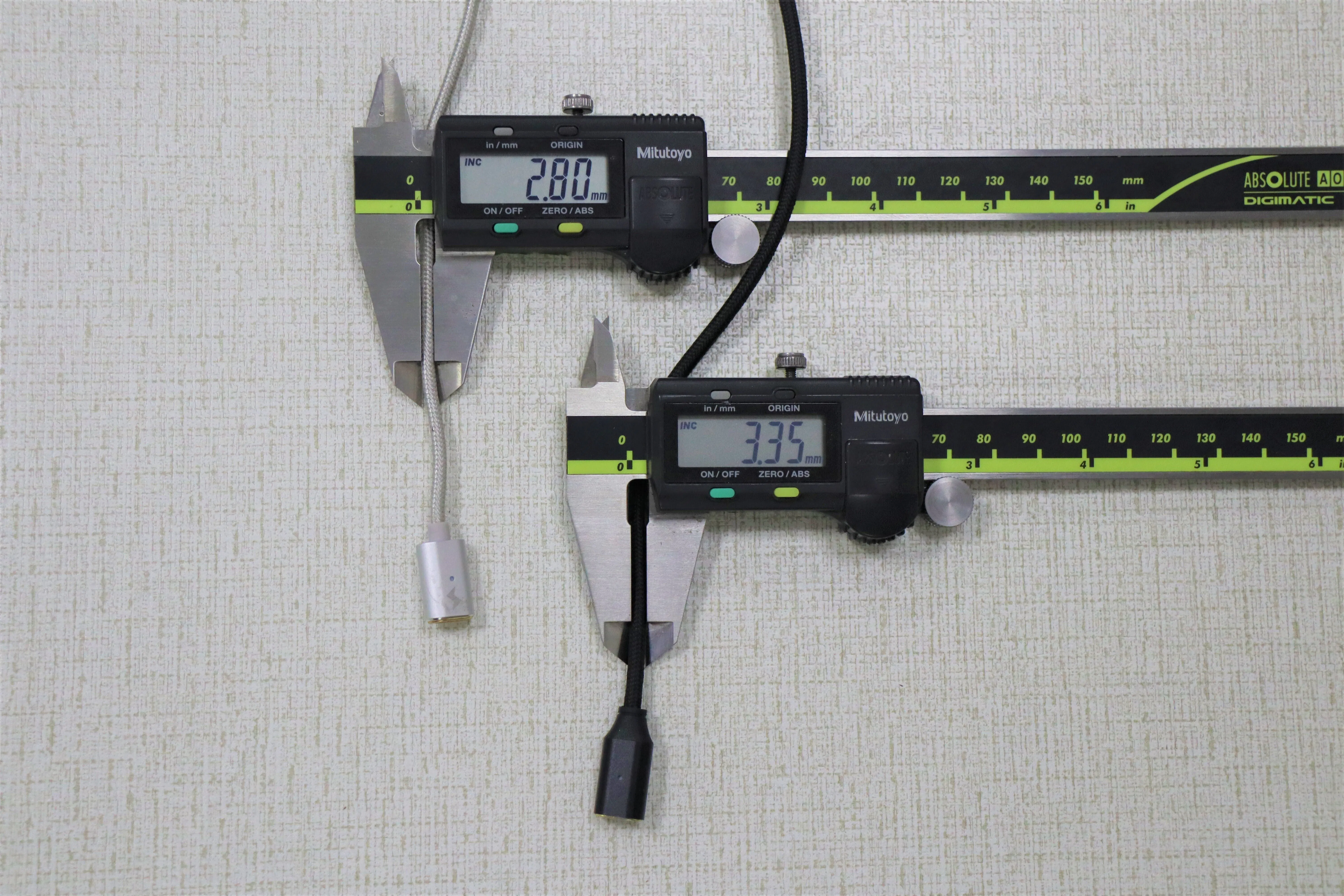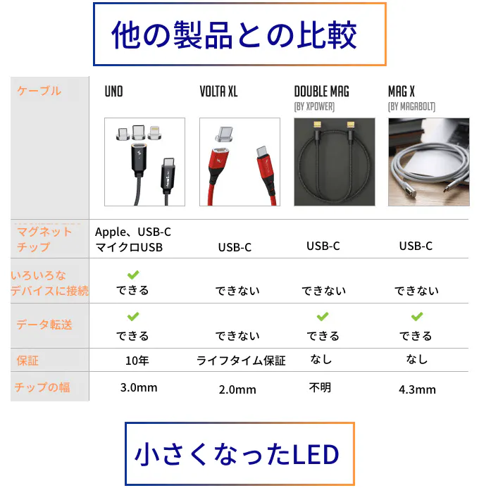 他のマグネットケーブルと違いは、マグネットコネクターのデザインです。両端(チップの端とケーブルヘッド)が凹形で斜めになっています。他の製品のデザインでは、きちんとケーブルと接続部分が配列されてなければ正しく接続することができません。しかも、マグネット強度の弱さも目立ちます。下の画像をご覧ください。どれが私たちの製品か、わかりますか?
