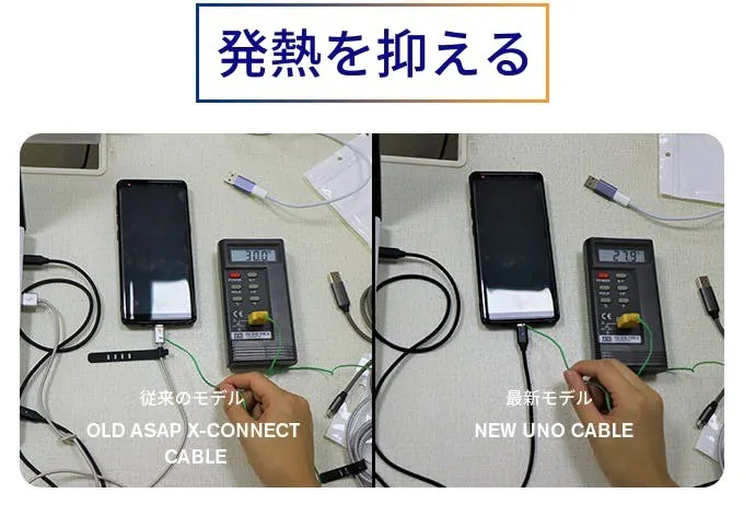 弊社では、より良い製品を作るために改良を重ねてまいりました。今回最新のUNOケーブルは、擦れたり断線しないように改良されたモデルです。断線しやすい場所でも、耐久性があります。ご覧いただくと、UNOケーブル(右側)がどれほど太いかお分かり頂けると思います。このため、ほつれにも強く、ケーブルの寿命も延びたため、保証を10年間つけることができました。