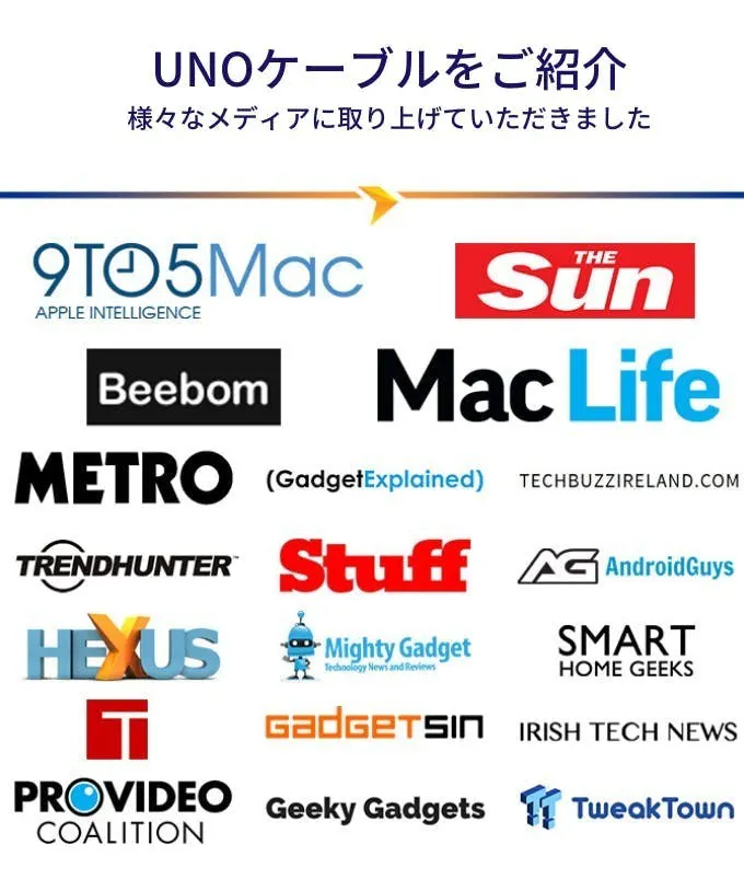 クラウドファンディング を通しケーブルを開発してきたから辿り着いた最先端のロックメカニズム組み込みとUNOケーブル磁石の強力化。接続をパワフルにする事で、長持します。また、マグネットが強力なことで、より重いケーブルも支えることができます。そこで、長いケーブルをお届けすることが可能になりました。どのケーブルセットも1.5mのケーブルとともにお届します。従来のモデルと比べて、さらに、最大接続回数を30000回から40000回にまで増やすことができました。