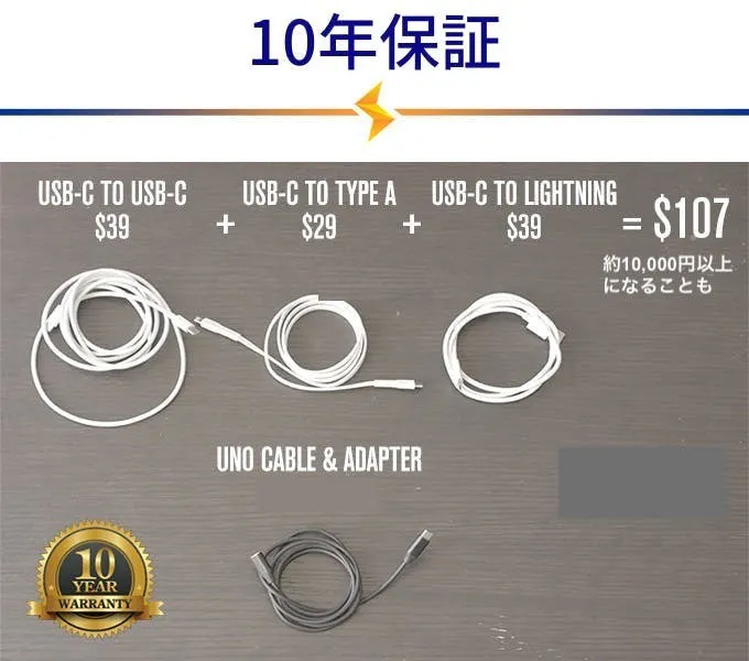 UNOケーブルは、他のケーブルを買い揃えるよりも、値段が5分の1。UNOケーブルの素材と製造工程によって、通常保証期間が1年の所、10年にまで伸ばすことができました。この先10年、スマホを買い換えても、ケーブルは保証付きです。