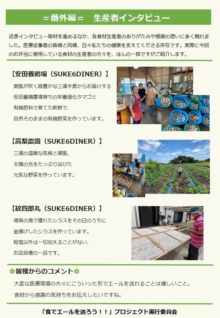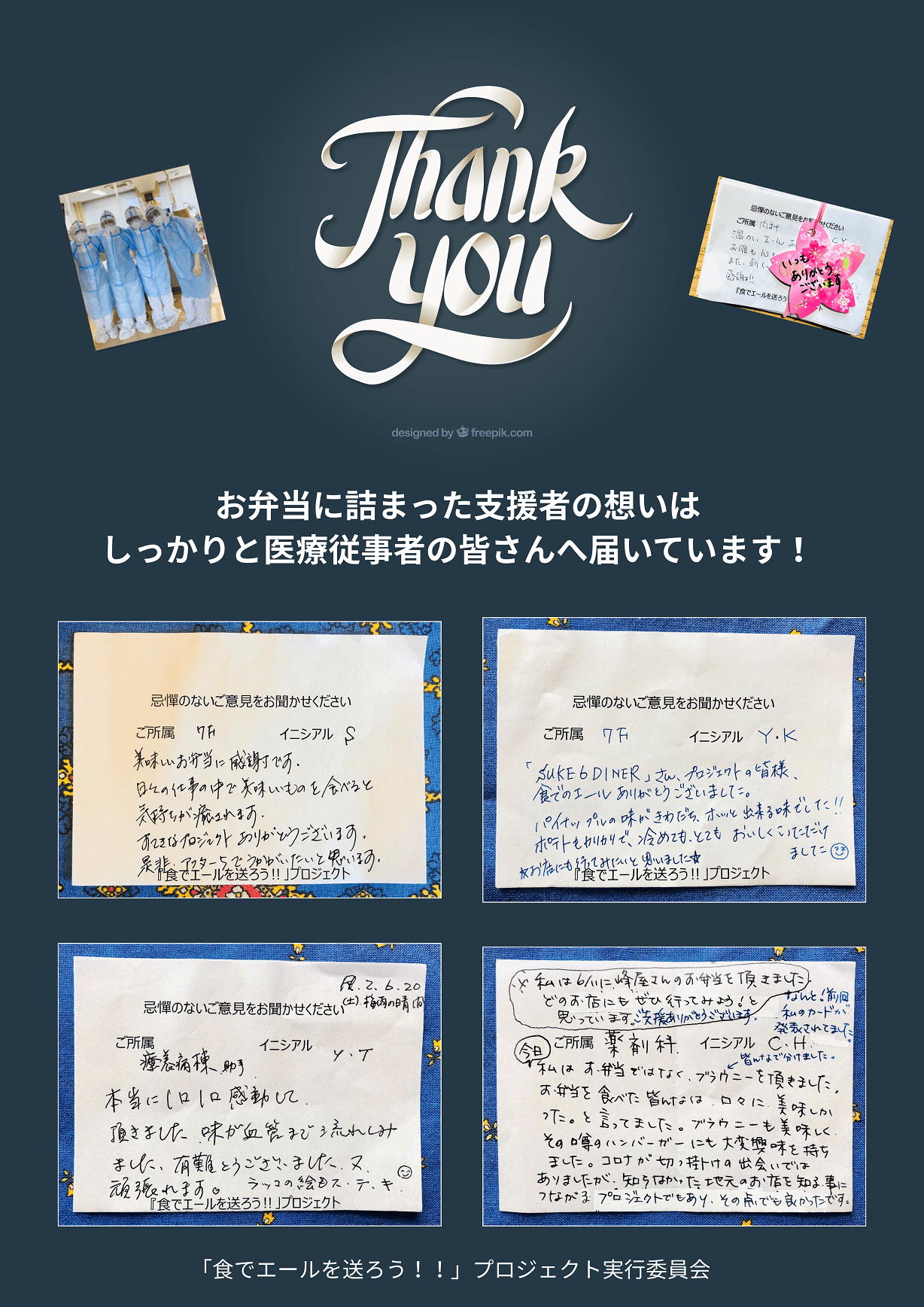 皆さまのご支援に対し感謝のメッセージが沢山届いています。同愛記念病院、賛育会病院、いずれもご紹介しきれないほどのメッセージがあり今回も多くの中から12枚をお届けいたします。先日、同愛記念病院の皆さんから、各協力店及び実行委員会へお花が届きました!院内でクラウドファンディングをして、集めたお金で送ってくださったとのこと。「皆で少しづつ出し合いました。私たちの気持ちです。」とのお言葉を頂戴しました。全く予想外の事に驚きましたが、これも皆さんからのご支援で届けしたお弁当を喜んでいただけた証しだと大変嬉しく思いました。私たちの喜びを皆さんと共有させて頂きます。メッセージと共に美しいお花をご覧ください。「食でエールを送ろう!!」PJ実行委員会一同
