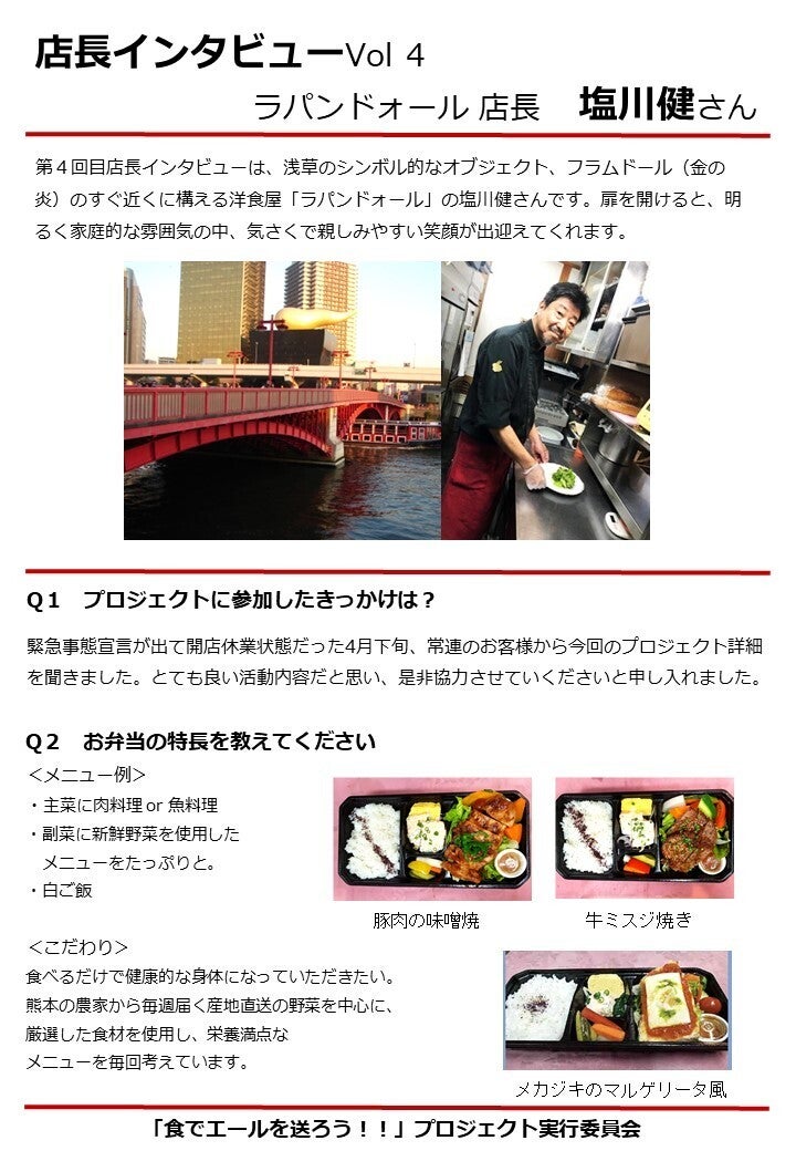 店長インタビュー4回目は、ラパンドォール店長の塩川健さんです。2017年10月に浅草にOPENした洋食ビストロ。産地直送の野菜や新鮮な肉・魚介を使用した栄養満点なお料理が魅力的です。塩川さんの想いをこのインタビューを通してお届けします。「食でエールを送ろう!!」PJ実行委員会
