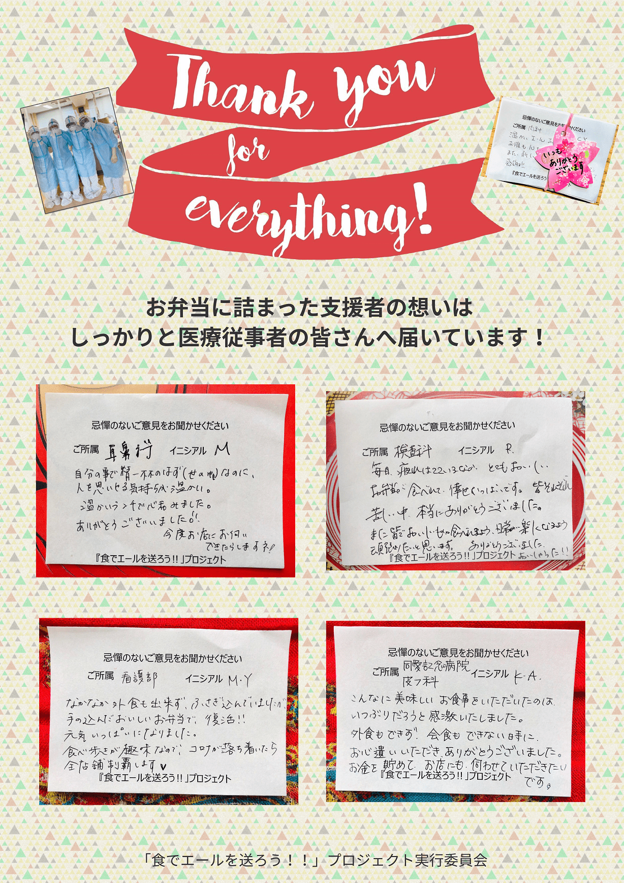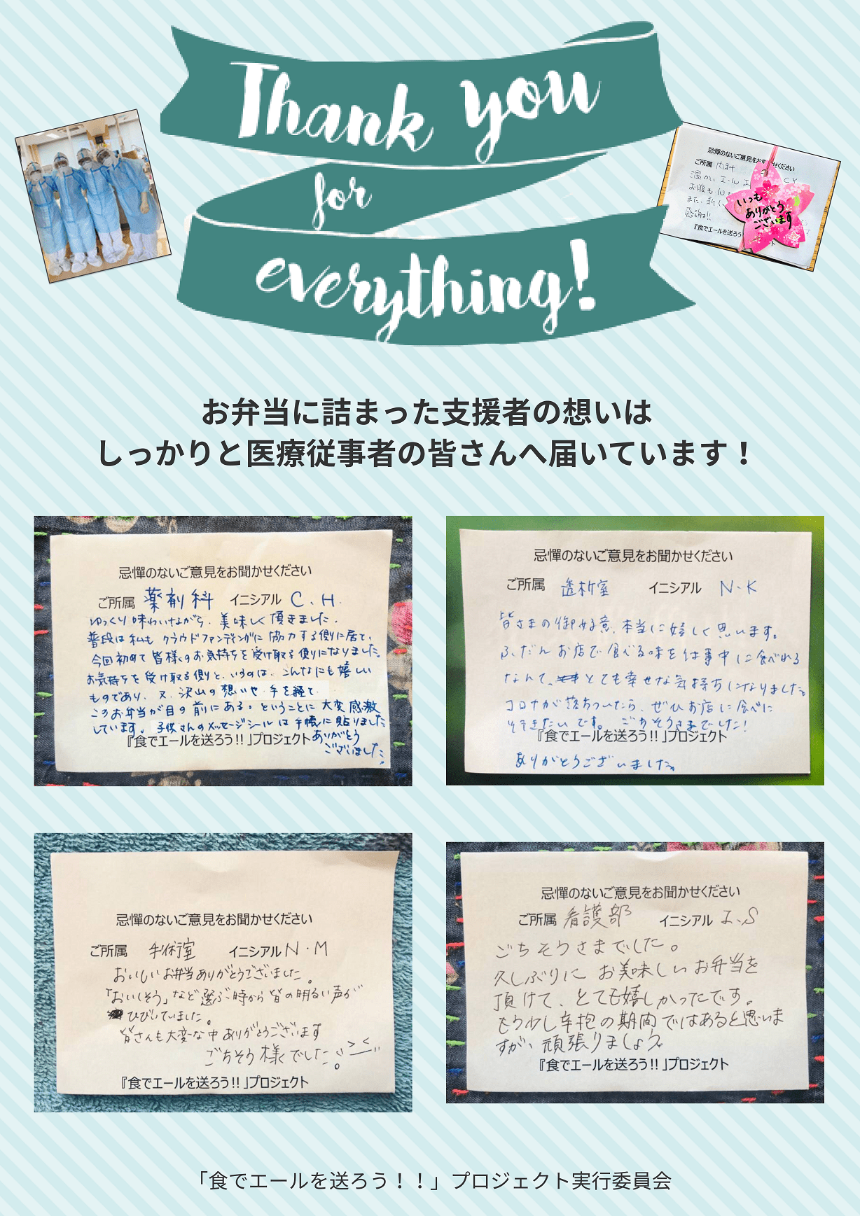 皆さまのご支援に対し感謝のメッセージが沢山届いています。今回も引き続き、多くの中から12枚をお届けいたします。「食でエールを送ろう!!」PJ実行委員会一同