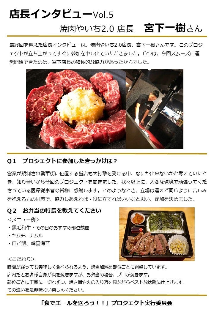 ついに最終回となりました、店長インタビュー5回目は焼肉やいち2.0店長の宮下一樹さんです。2018年12月に、西浅草「焼肉やいち」の2号店として御徒町にOPEN。A4&5ランクの雌の和牛のみ仕入れおり、まろやかで柔らかいのに油っこくないとにかく上質なお肉を堪能できます!本プロジェクトをスムーズに開始できたのは、宮下店長の積極的な協力があってこそでした。宮下さんの想いをこのインタビューを通してお届けします。「食でエールを送ろう!!」PJ実行委員会