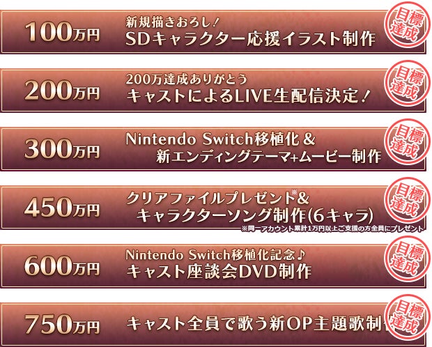 100万達成で「新規描きおろしSD応援イラスト制作」、200万達成で「キャストによるライブ生配信」 、そして最終目標にはもっともっと沢山の人にプレイして欲しいという思いを込め、Nintendo Switch版への移植化を掲げております!
