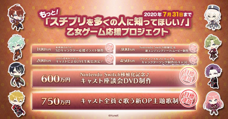 5月から開始した本プロジェクトですが、無事に7月末日で終了いたしました!最終的になんと900万を突破し、総額9,258,000円という支援が集まりました。まずは、ご参加いただいた皆さま本当にありがとうございました!========================●最終金額【9,258,000円】●達成目標100万円 新規描きおろし!SDキャライラスト制作200万円 キャストによるLIVE生配信決定!300万円 Nintendo Switch移植化&新エンディングテーマ&ムービー制作450万円 キャラクターソング制作(6キャラ)600万円 キャスト座談会DVD制作750万円 キャスト全員で歌うOP主題歌制作========================皆さまのお陰によって、目標も全て達成することができました…!まさか最終的にここまでのご支援が集まるとはスタッフも正直想像もしておらず…、驚きと嬉しさでいっぱいでございます。ご支援いただきました皆さま、いつもスチプリを応援してくださる皆さま、そして、今回のプロジェクトで初めてスチプリに興味を持ってくださった皆さま、改めましてお礼申し上げます。本当に本当にありがとうございました!!“たくさんのユーザー様へスチプリを知っていただきたい!スチプリをこのままで終わらせたくない…!”そんな思いではじまった今回の応援プロジェクトですが、皆さまからのご支援やいただいた沢山の熱い応援メッセージを拝見し、スチプリはまだ今後も展開をし続けられるんだ…!という嬉しさを改めて感じることができました。多くの方に支えられている本タイトルを今後も盛り上げていくべく、スタッフ一同これからも尽力してまいりますので、引き続き見守っていただけますと幸いです。そして、ご支援者様へのリターン品につきましても鋭意制作中です!無事にお届けできるまで、こちらの活動報告でも進捗情報をお知らせしますので、ぜひ今後も覗いてみてくださいね。皆さまにご満足いただけますよう、そして安心してお待ちいただけますよう努めてまいりますのでよろしくお願いします。それでは、今後ともスチームプリズンを宜しくお願いいたします!