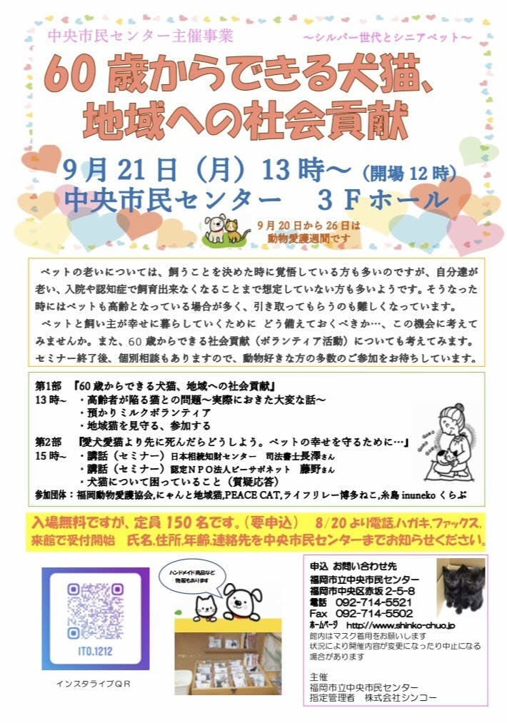 2020/07/21 21:00〜お知らせ〜..9月21日(月)13:00〜..場所:中央市民センター3階..【60歳からできる犬猫、地域への社会貢献】を行います!!..第一部、第二部とありますので詳しい内容はチラシをご覧ください★..この日のために作ったハンドメイド商品の物販販販売しています^^..コロナの影響のため、入場人数に限りがります。そのためインスタライブを行う予定です。是非当日にご覧ください★. もっと見る