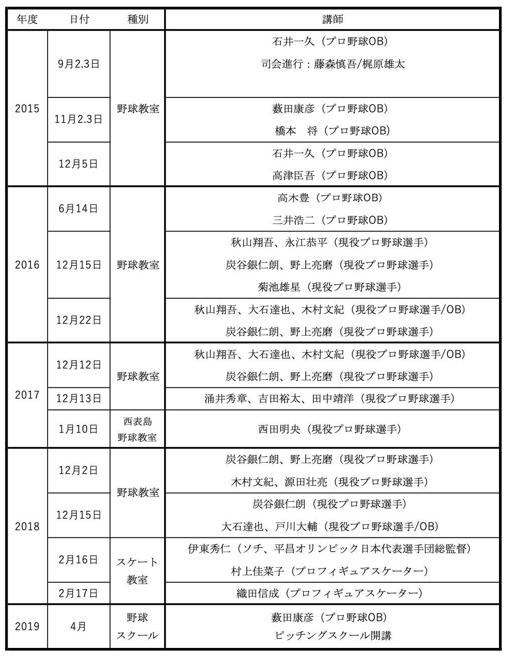 その講師役にはスポーツを通して夢を掴んだ現役プロスポーツ選手、プロスポーツOB等の一流の技術を持った方々を当社にて招聘し、その指導を受け将来の夢や希望を子どもたちに与える事を目指しております。