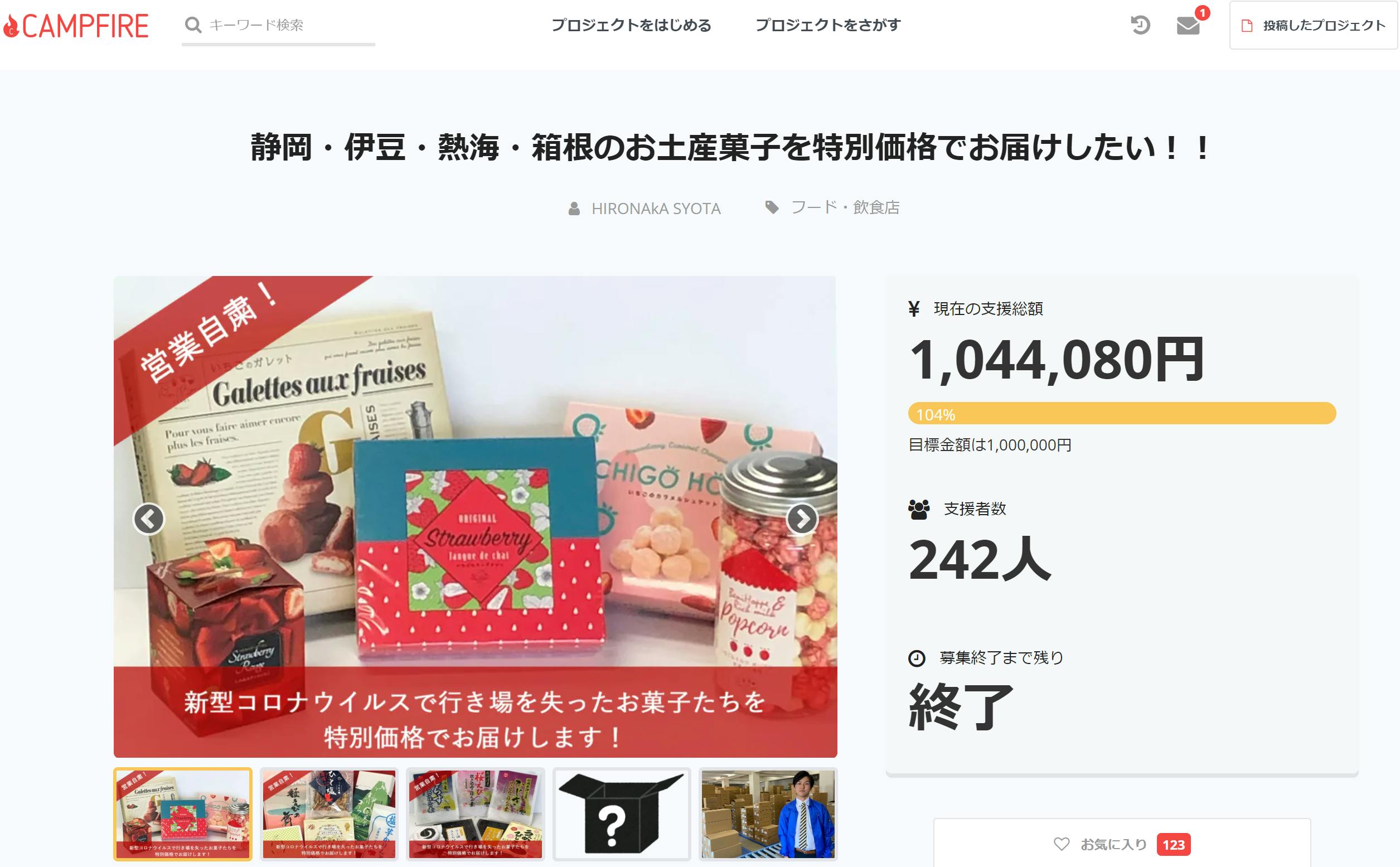2020/06/09 19:04クラウドファンディングが終了しました!約1か月の期間を終えて、目標金額1,000,000円に対して、1,044,080円、支援者数242人で達成することができました。皆様の温かいご支援に感謝いたします。この企画を始めるまでは、こんなにたくさんのご支援をいただけるとは思いませんでした。またたくさんの方々に励ましのお言葉をいただき、大変温かい気持ちになりました。どんな状況でも救いの手を差し伸べてくれる人がいると分かって嬉しくなりました。皆様のおかげで賞味期限間近の在庫がかなりなくなりました。皆様のご好意を返せるように、「ワクワクする地域の未来づくり」をしてまいります。本当にありがとうございました。ご支援いただいた方々は、商品が届くのを楽しみにしててくださいね!! もっと見る商品の発送は6/11から順次行います!