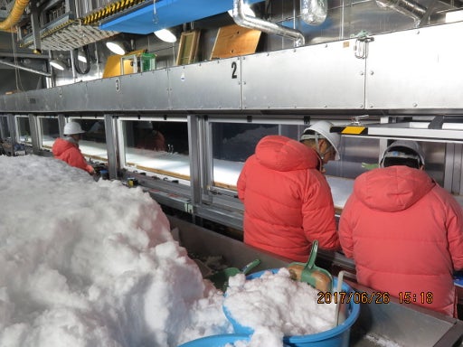 吹雪を起こすことのできる風洞装置は,気温-15℃前後の大きな部屋の中にあります。とても寒いので,まさに南極地域観測隊が着ているような上下の羽毛着と厚底の防寒靴を身に着けて中に入ります。分厚くてあったかいお布団を纏っているようでした。