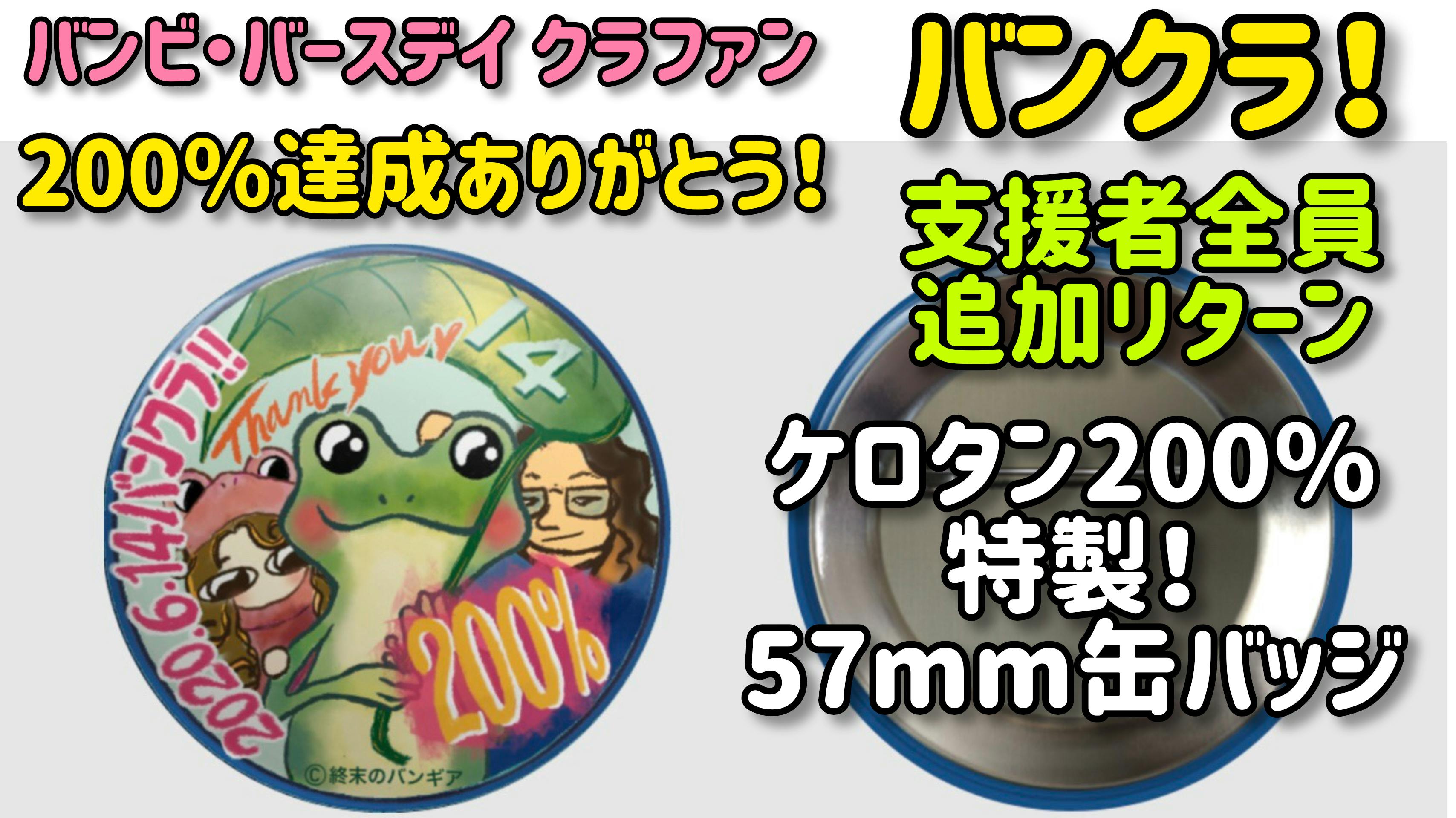 2020/06/18 17:20バンビ・バースデイ・クラウドファンディングプロジェクト「バンクラ!」の追加リターンとそれぞれの送付時期のお知らせです。この度、プロジェクトのNext Goal200%が達成した記念に支援者全員に特製の「ケロタン200%」缶バッジをお贈りすることになりました。「ケロタン」とは バンギアがお届けしているバンギア・クリーチャーズ・コインコレクションのNo14として発表したクリーチャーです。バンビのバースデイである14日にちなんで「ケロタン(誕)」と命名され、特別デザインのコインアートも当日限定で無料配布されました。梅雨の時期にぴったりな幸せを呼ぶカエルをお守りとして持っていていただきたい、という想いを込めて描かれた作品です。 今回はその「ケロタン」コインアートを”200%達成記念”バージョンにアレンジして、57mmという少し大きめの缶バッジとしてお届けすることになりました。お届けまでしばらくお時間をいただくことになりますが、お楽しみにしていただけると嬉しいです。各リターン品の発送時期について 今回、ご支援いただいた方へのリターン品のお届けですが、「歌詞の決まってない歌~幻の限定CDボックス」以外のものは、7月末までを目処に送付させていただく予定です。複数ご支援いただいている方へは、まとめての発送になりますので、あらかじめご了承くださいませ。 「歌詞の決まってない歌~幻の限定CDボックス」は完成次第お送りいたしますが、現在のところ9月以降になる予定です。こちらだけ個別にお送りさせていただきます。 また、リターン品の「つぎにでるシングルCD」を選択された方も、出来次第まとめての発送となります。こちらの発送時期はいまのところ8月中となっております。※工場からの納品タイミングでできるだけ早くお届けいたします。それぞれの発送などは、また状況が分かりしだいお伝えいたします。それでは、引き続きよろしくお願いいたします。 もっと見る