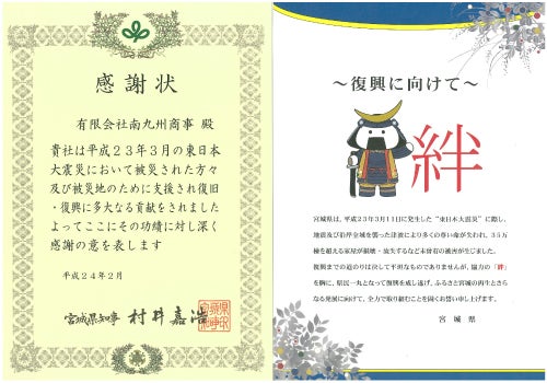【平成24年時の宮城県知事からの感謝状】