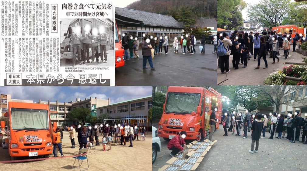 2011年の東日本大震災や2016年の熊本地震の際、微力ながら私にも何かできないかと考えた結果、冷たい非常食しか食べれず疲弊しているであろう被災者の方々に対して、弊社は温かい食事を提供できる!と思い立ち、宮崎県から移動販売車(キッチンカー)で現地に赴き、肉巻きおにぎりのふるまいをさせて頂きました。一瞬でも、被災者の方々の笑顔がみれた瞬間、よかったと心から思いました。しかし、このふるまいも私一人の力ではできません。一緒に被災地に出向き、ふるまいをサポートしてくれた従業員、工場で時間いっぱい肉巻きおにぎりを作ってくれた従業員、ふるまい提供のため資金繰りが難しい中、材料の手配や商品の配送に奔走してくれた従業員…誰一人が欠けてもできなかったことだと従業員たちを誇りに思いました。その従業員たちの暮らしを今後も守っていけるのか…この新型コロナウイルスの経済危機は、私も今まで経験したことがないほどに逼迫した状況です。苦しい時、大変な時期も何とか弊社を支え続けとうとしてくれた従業員たちを守りたい。その気持ちが、今回クラウドファンディングに挑戦しようと思った一番大きい理由です。