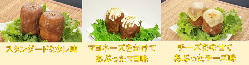 【あぶりマヨネーズ味】市販のマヨネーズを肉巻きおにぎりの上にお好み量かけて、ガスバーナーで5秒程度マヨネーズ部分をあぶってください。