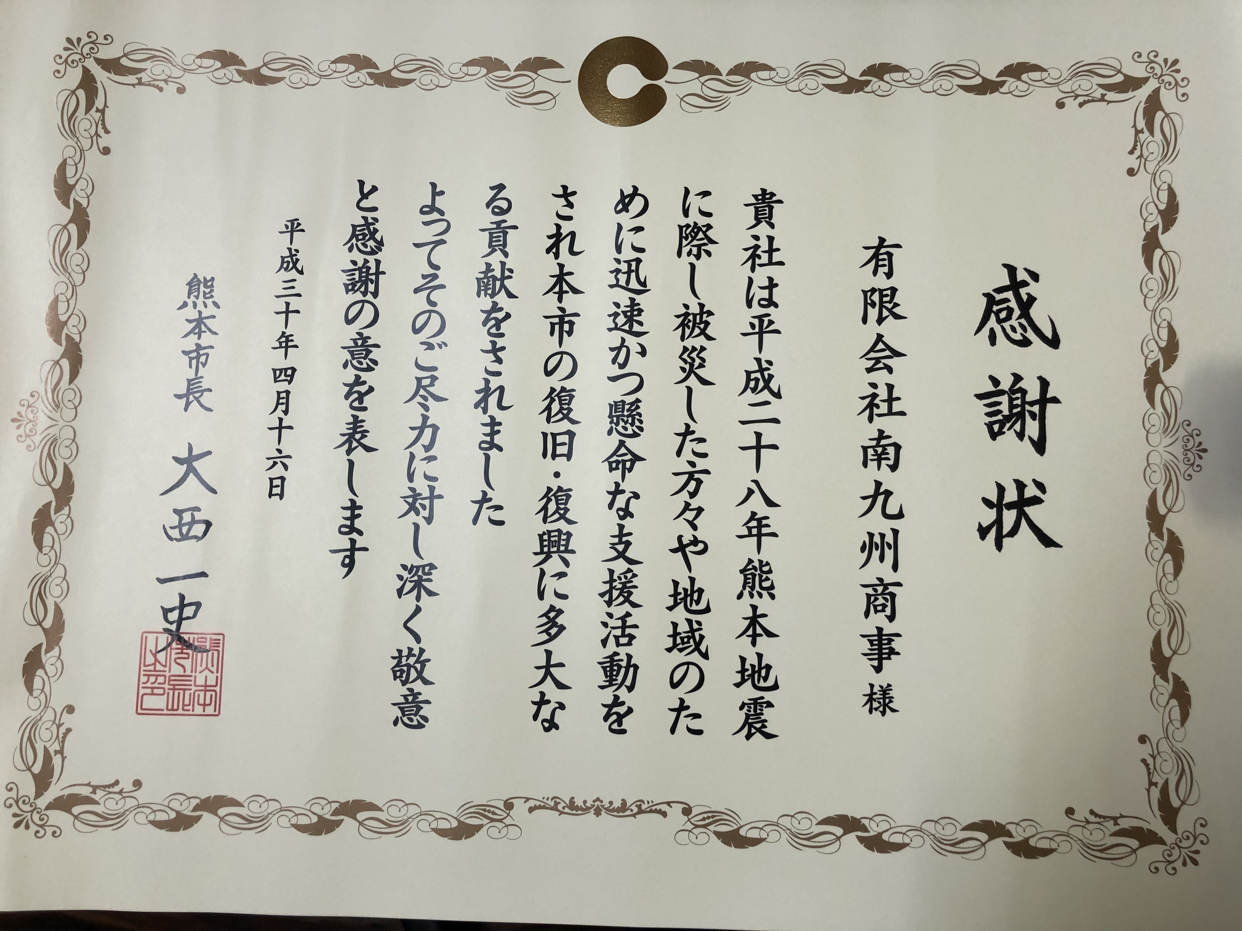【平成28年時の熊本県知事からの感謝状】