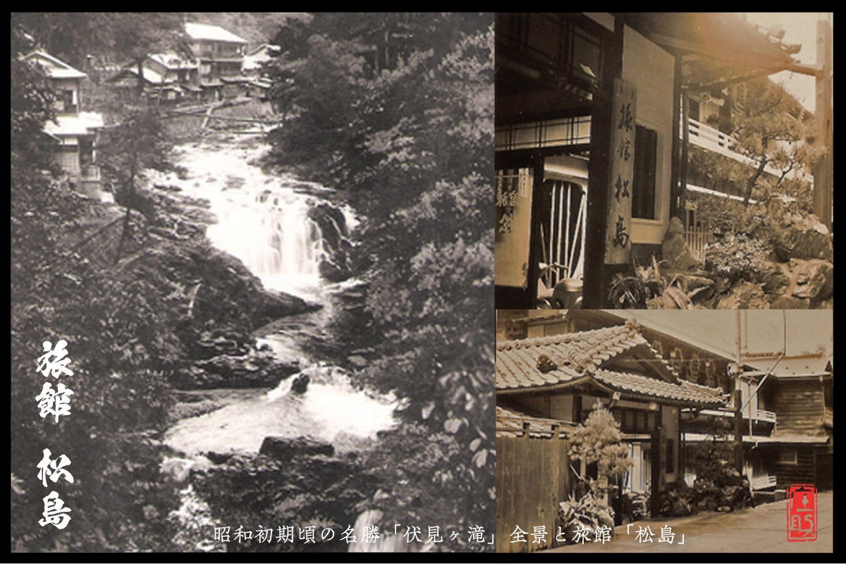 【※画像①】画像は昭和初期頃の名勝「伏見ヶ滝」と、その当時の旅館「松島」
