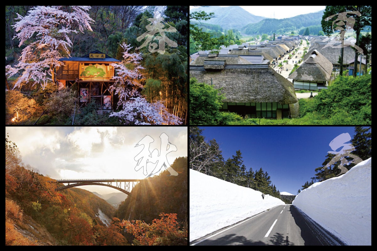 【※画像③】『左上』当館自慢の「能舞台 花心殿」『右上』江戸時代情緒が残る「大内宿」『左下』紅葉が見事な「つばくろ谷」 『右下』冬の「磐梯吾妻スカイライン」