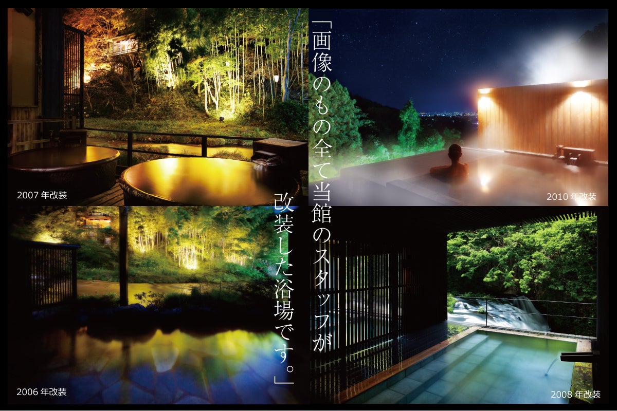 ■当社の改装プロジェクトメンバー(当社で働く元内装業、元塗装業、元リフォーム業、元設備管理者など)を中心として、新しいラグジュアリーな絶景の屋上貸切風呂を新設いたします。国内外で活躍する「建築家」をはじめとして、数々の受賞歴を誇るデザイナーもプロジェクトに携わり、「和のリゾート構想」をベースに、今まで以上の新しい貸切風呂を作ります。