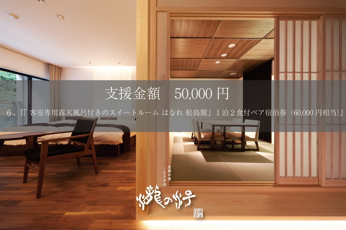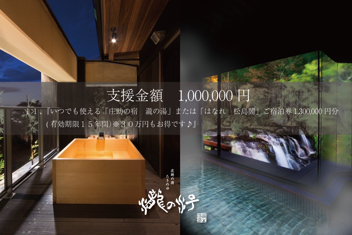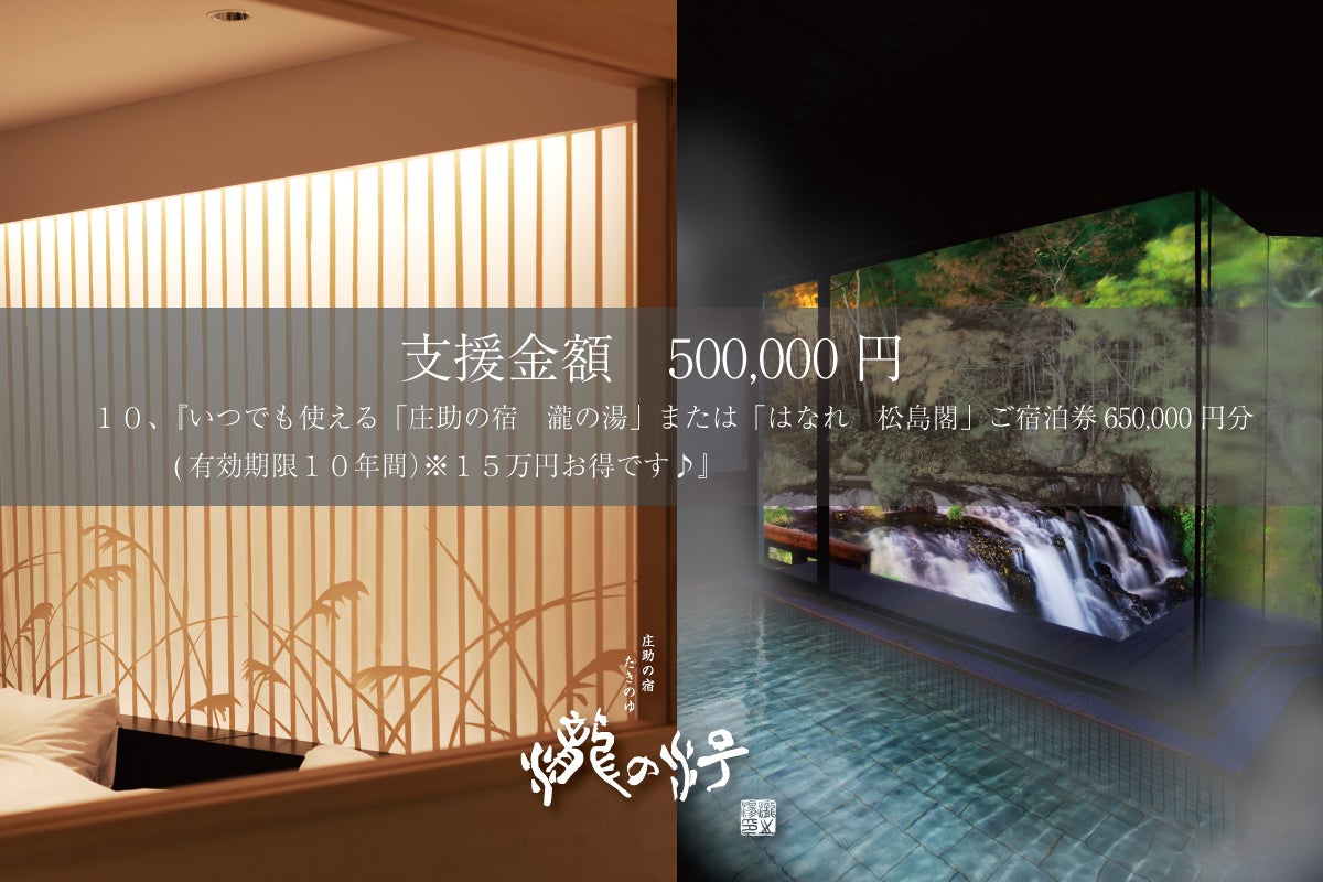 リターン 『いつでも使える「庄助の宿 瀧の湯」または「はなれ 松島閣」ご宿泊券650,000円分 (有効期限10年間)』※150,000円分お得です♪