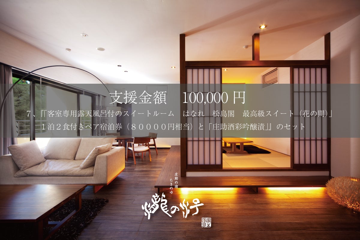 リターン 『「客室専用露天風呂付のスイートルーム はなれ 松島閣 最高級スイート(花の間)」朝・夕食憧れのお部屋食とオプション付き・1泊2食付きペア宿泊券(80,000円相当・有効期限1年間)と「庄助酒彩吟醸漬セット(10,000円相当)」「いつでも使える庄助の宿 瀧の湯宿泊券30,000円分付き(有効期限1年間)」』なんと20,000円分もお得♪